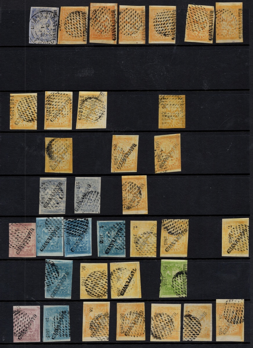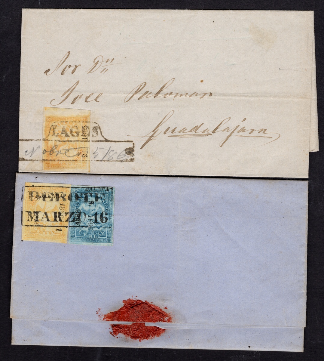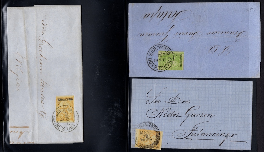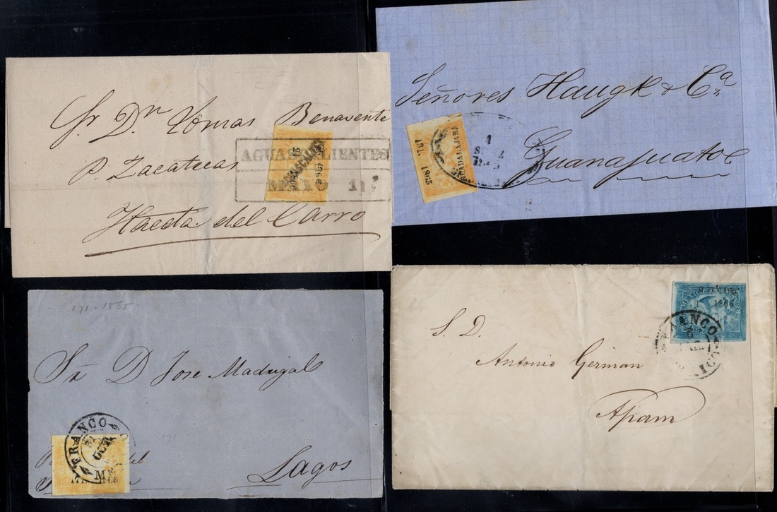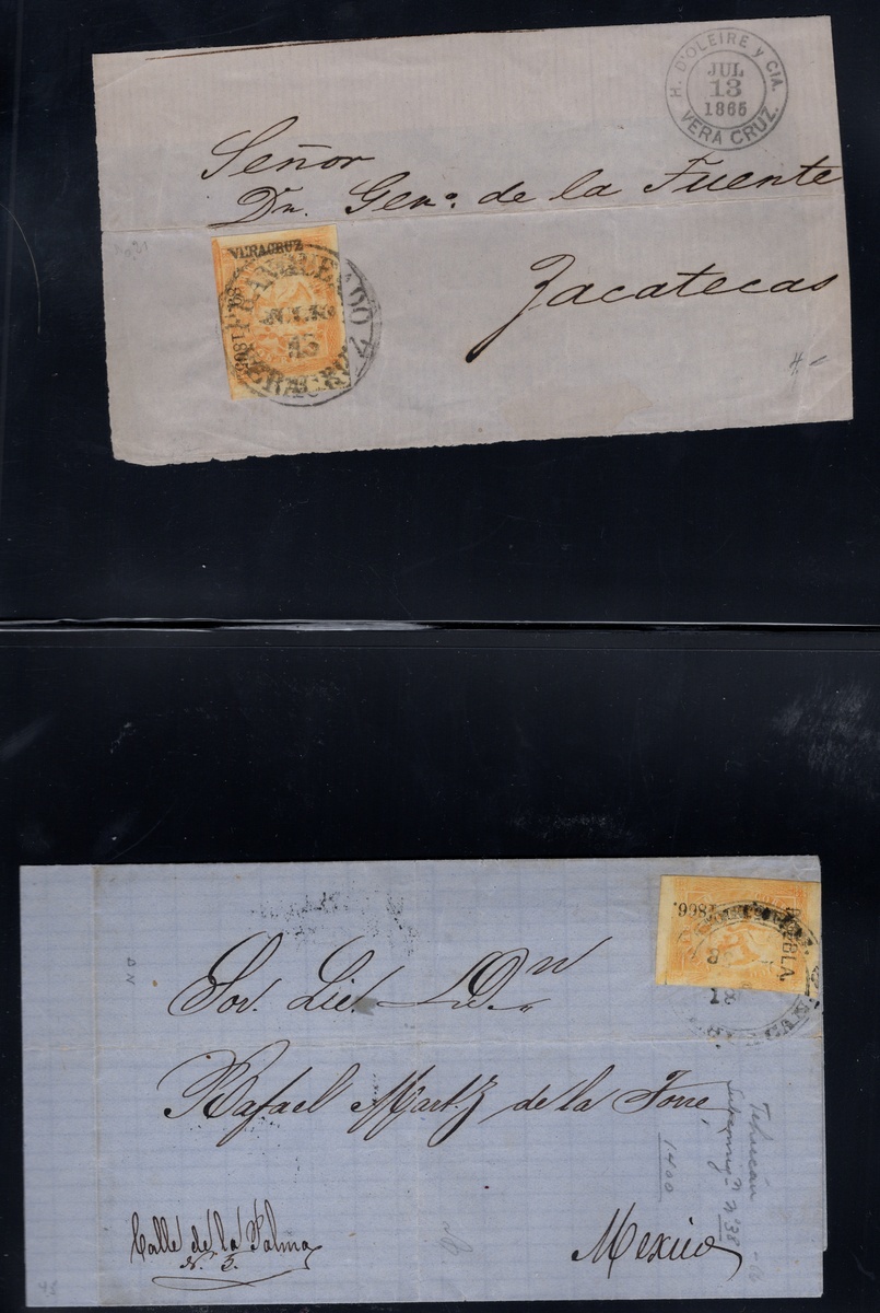 Various Districts Assembly comprising 136 stamps used and unused, eleven covers and two cover fronts, with all five Periods represented. Some of the many highlights include: an appealing ½r. Brown 1st Period unused (tight margins, but very scarce, Scott $400), 2r. Huejutla with Tuxpan h.s. on piece, fresh 1r. Soyaniquilpam 4th Period and seven 8r. displaying deep shades. Districts include Huejutla, Mexico, Guadalajara, Chihuahua, Aguascalientes, Guanajuato, Jalapa, San Luis Potosí, Soyaniquilpam, Veracruz and Orizava. Multiples include three unused blocks, including two eye-catching blocks of four: Mexico ½r. Lilac and 4r. Green (both #52-1865). The covers are in good condition and exhibit appealing cancels from Lagos, Perote, Jalapa, Aguascalientes and San Luis. One superb cover has a 4r. with three margins and a perfect cancel from Veracruz. One 1998 MEPSI certificate. Scott 19-25; NF $ 2,700 as singles off cover., , ,