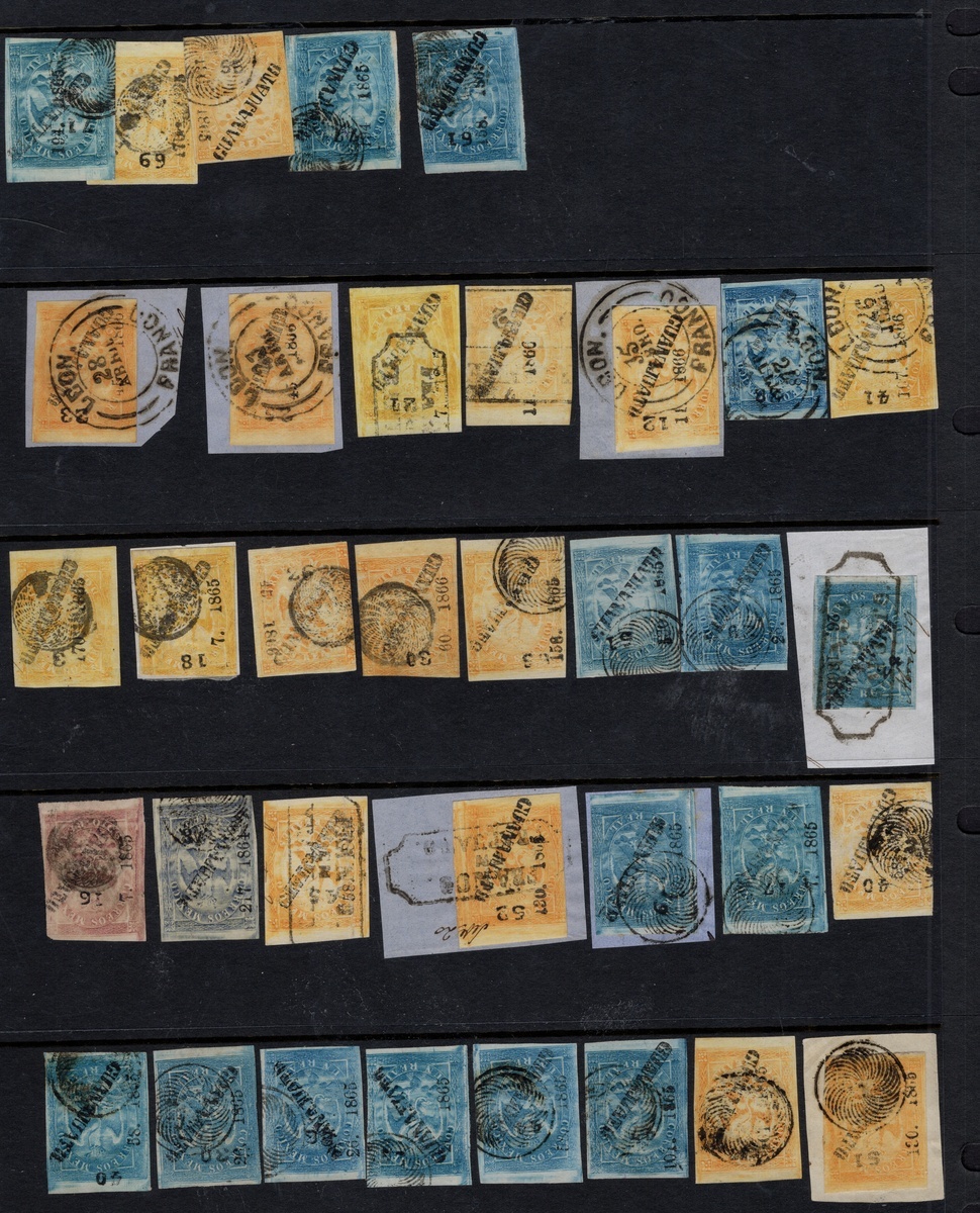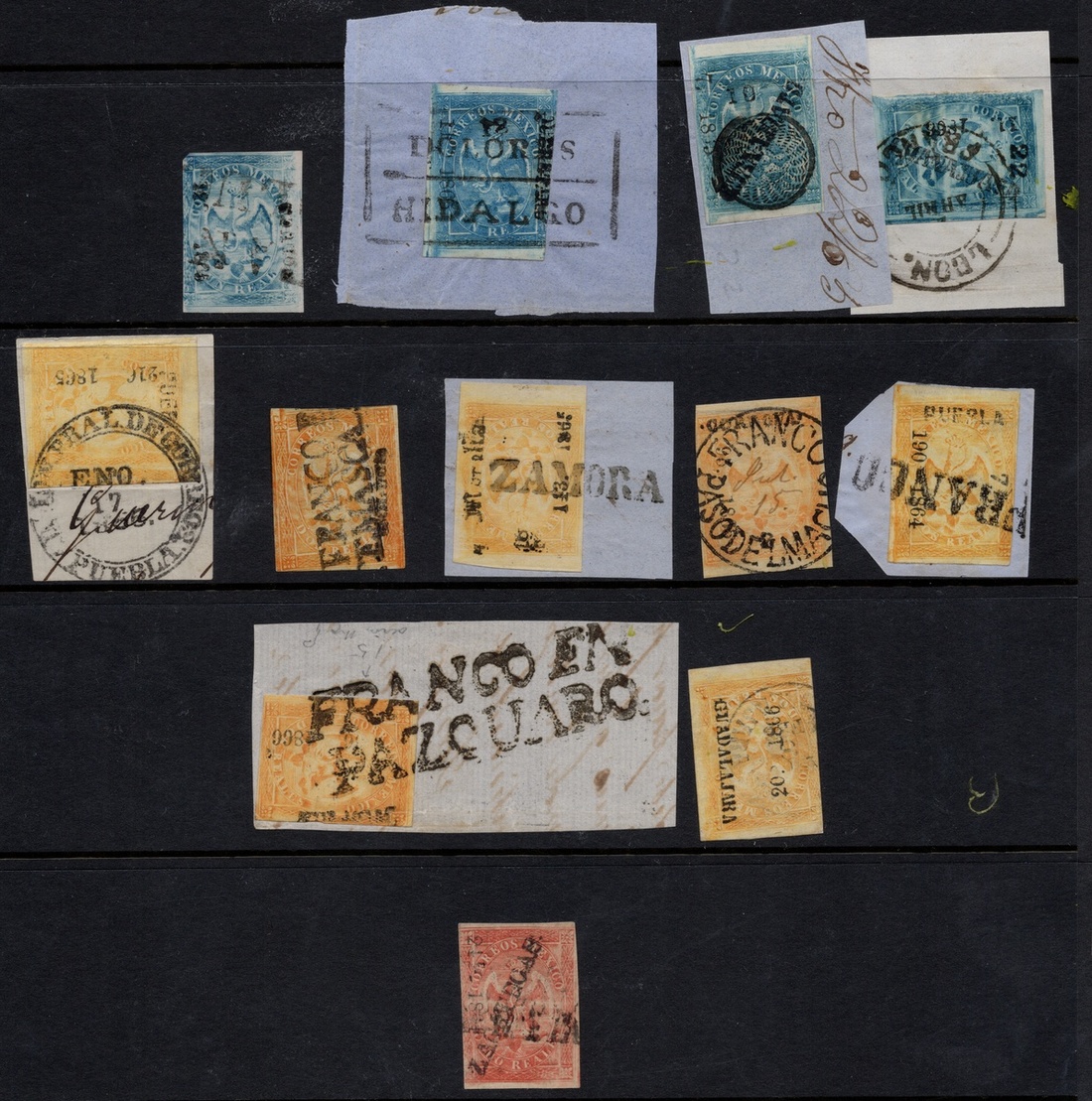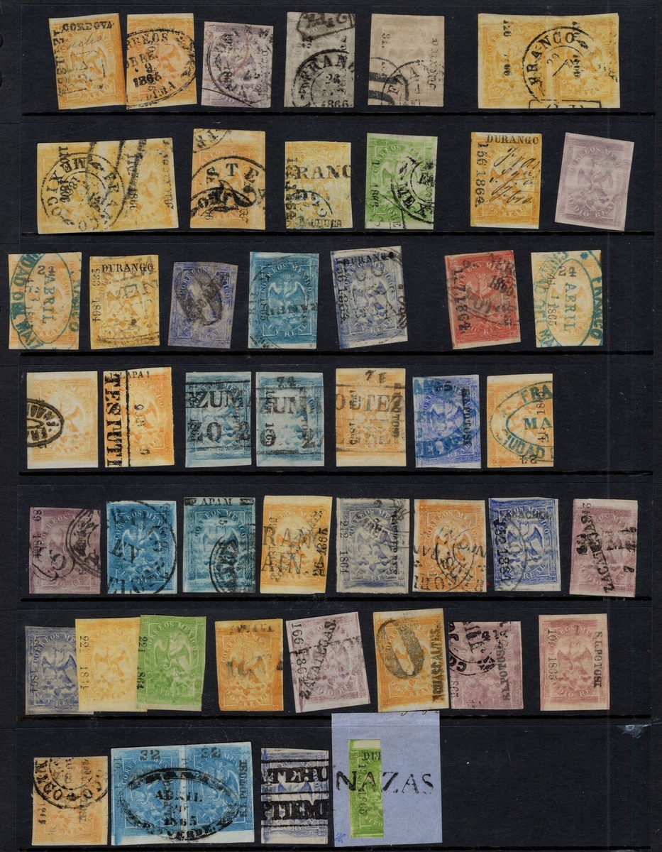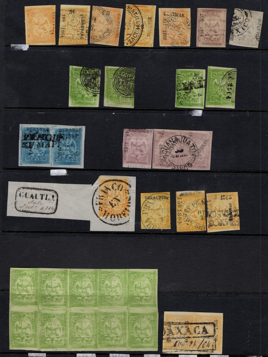Various Districts> Assembly comprising over 100 stamps, most used, including all periods. Districts include Cordova, Colima, México, Pachuca, Durango, San Luis Potosí, Zacatecas, Veracruz, Apam, Aguascalientes, Guanajuato, Chalco, Toluca, Orizava. There is a very attractive unused, unoverprinted block of ten of the 4r. green, margins all around, and a bisect on piece of 4r., cancelled in Nazas. Several cancels from sub-offices include Temascaltepec, Cuautla, Mapimí, Tepic, Zacualtipán, León, Silao, Matehuala, Ciudad del Maíz, Paso del Macho, Zamora, Dolores Hidalgo, Pátzcuaro, and others. The two 8r. red are used from San Luis Potosí and Zacatecas. Scott 21-25. $ 2,453., ,
