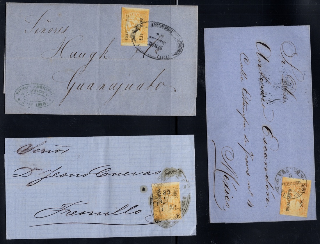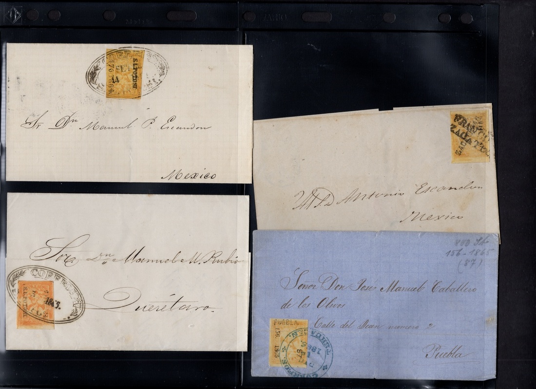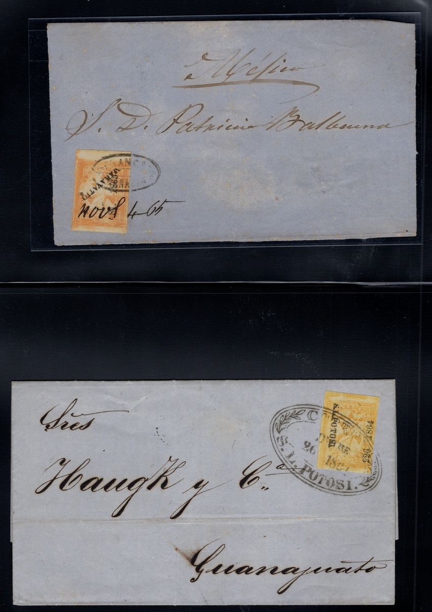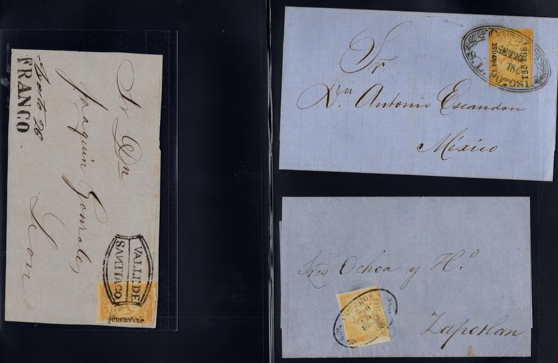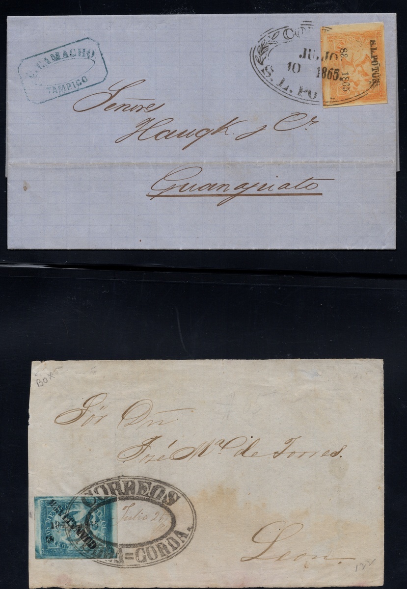 Various Districts Group of 16 covers and two cover fronts, with districts including San Luis Potosí, Colima, Querétaro, Apam, Guanajuato, Zacatecas, Puebla, Guadalajara, and Maravatío. Several attractive and scarce small-town cancels are present, including Piedra Gorda, Maravatío, Tehuacán, Villa de San Felipe, and a striking Valle de Santiago. Scott 21, 23.,