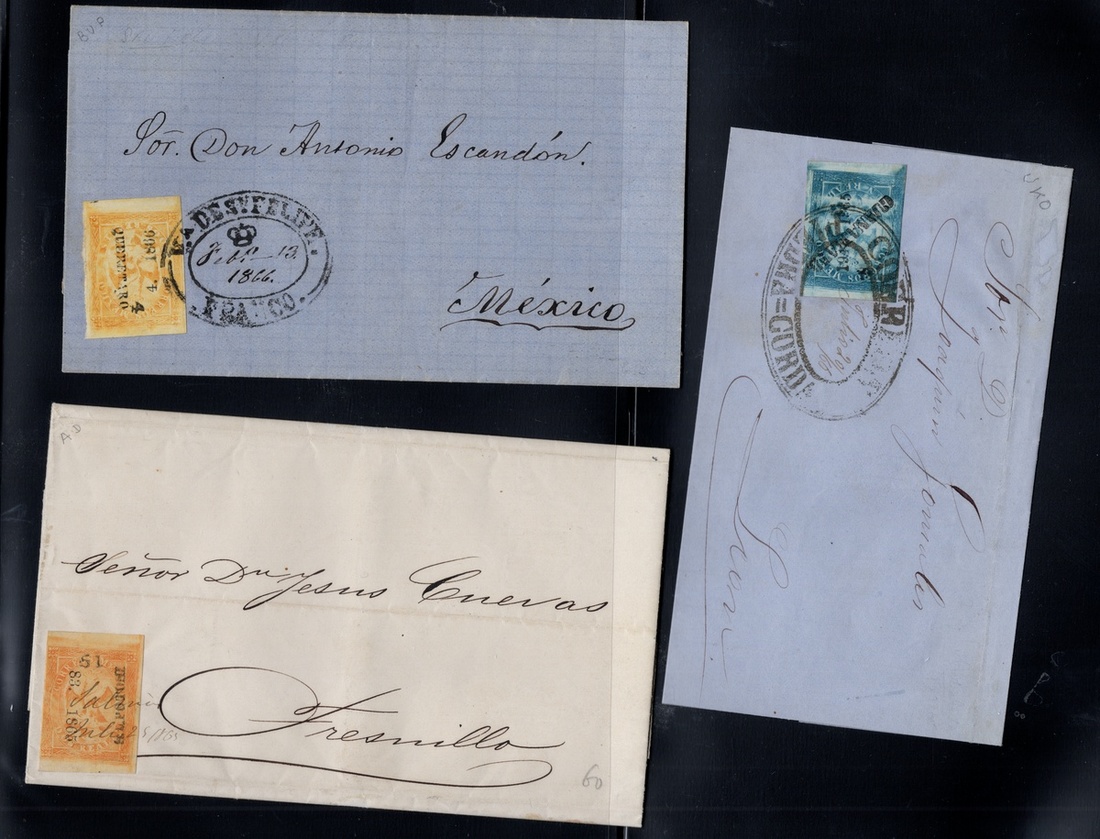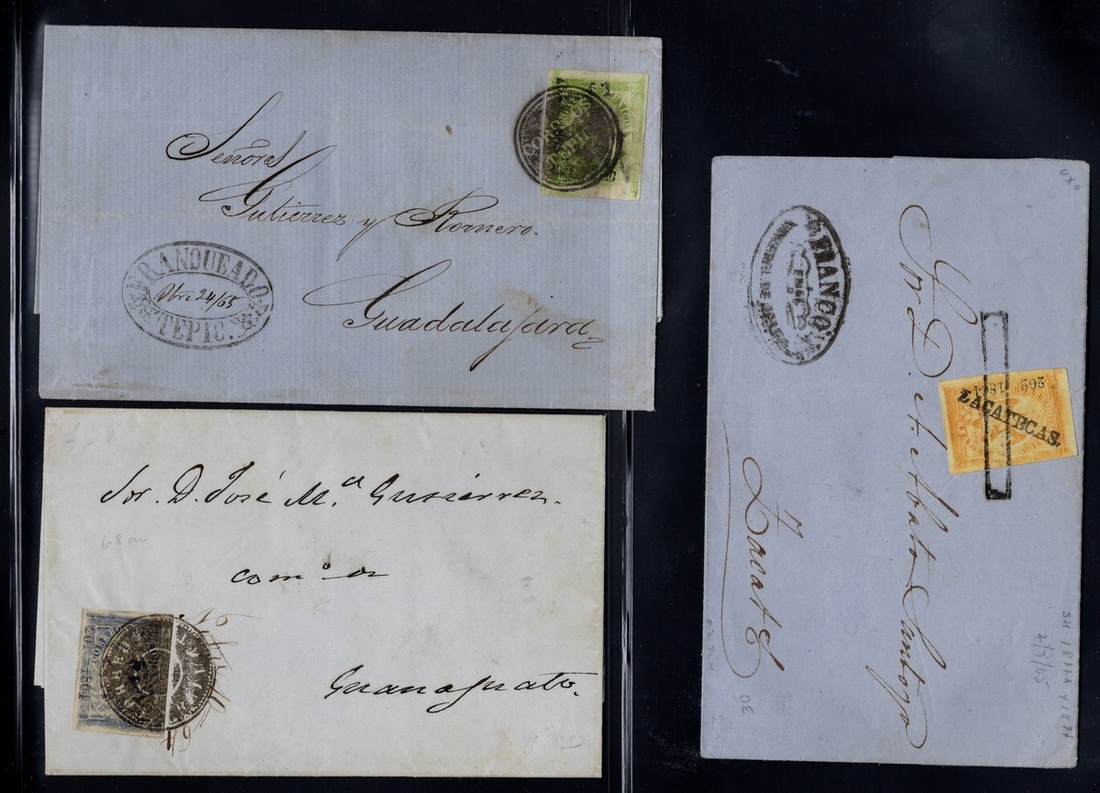 Various Districts Group of six attractive covers, bearing 1r. blue or 2r. yellow from sub-offices, displaying excellent cancels including Tepic, Guanajuato, Mineral de Jalpa, San Felipe, Piedra Gorda, and Salinas. Scott 21, 23.