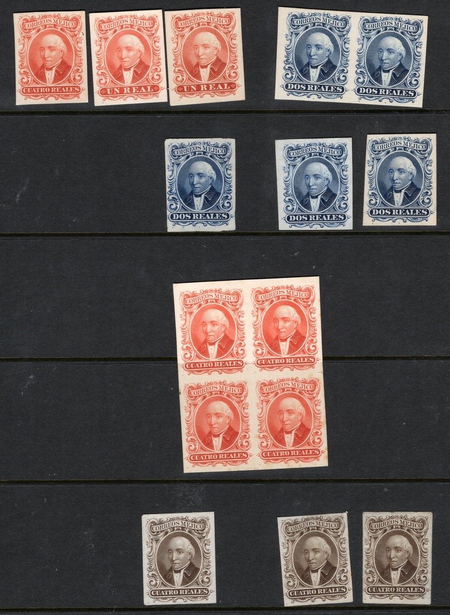 1864 Imperforate proofs of the 1r. (two), 2r. (five) and 4r. (eight), making up a group of 15, including ten on card (with a block of four of the 4r. in Orange), while the rest on India paper. All except the block of four are printed in the issued colors. Fresh and attractive. Scott 14v-16v.