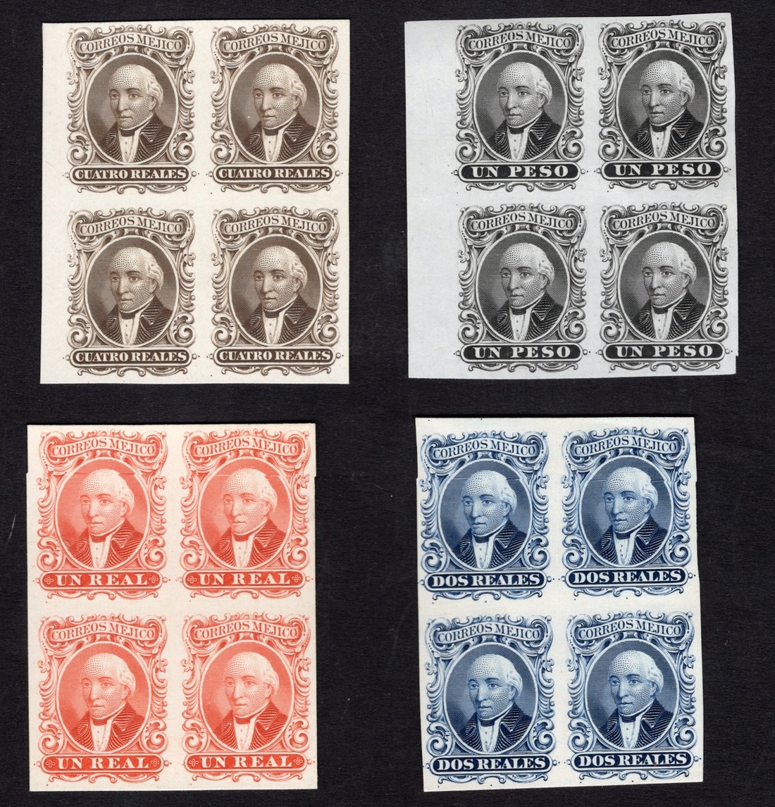 1864 1r., 2r., and 4r. on card, and the 1p. on India paper, all in imperforate blocks of four and printed in the same colors as the issued stamps. A rare and visually striking quartet. Scott 14v- 17v.