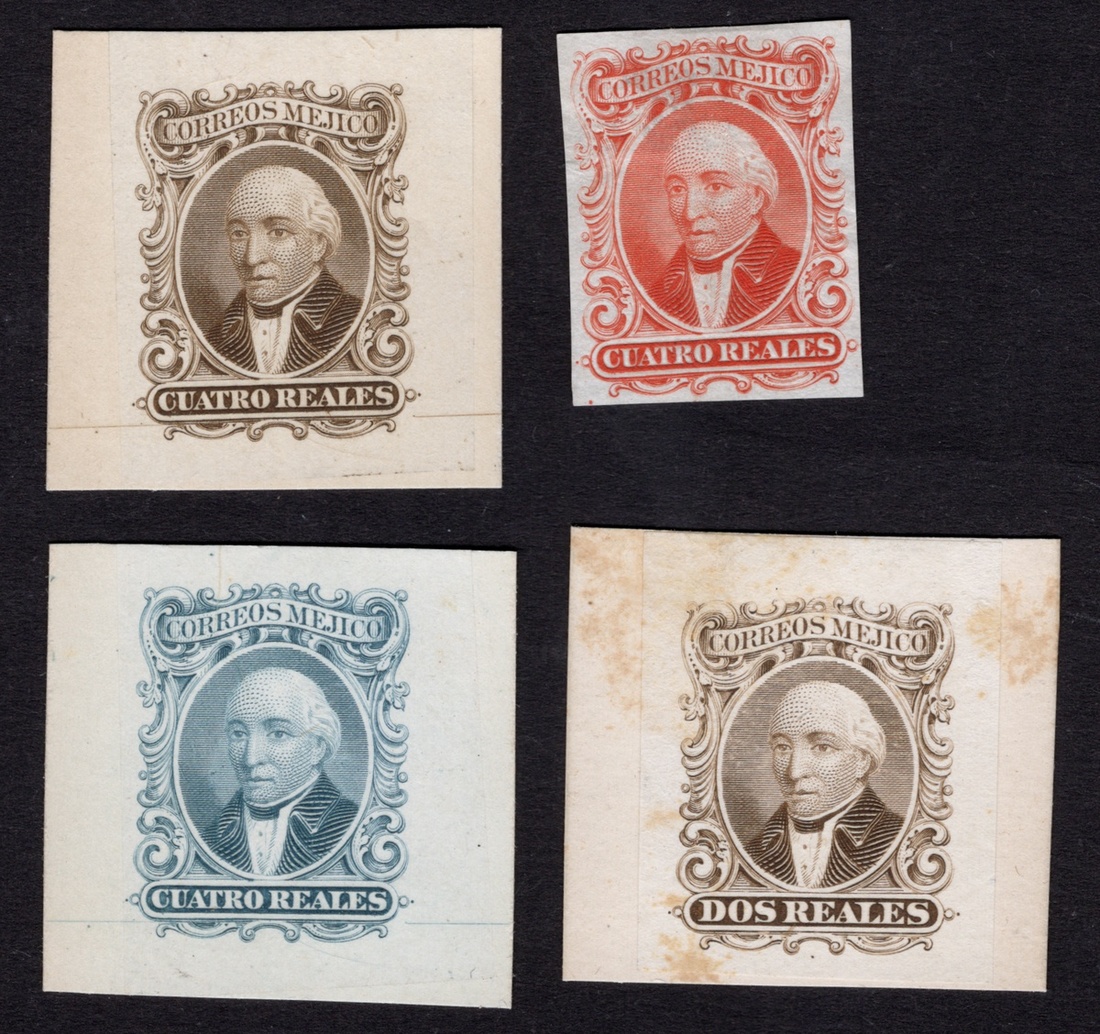 1864 Selection of four proofs, all printed on India paper, including three affixed to card with 2r. Brown and two 4r. in Blue, and Brown, and a 4r. Red not affixed to card. Very scarce, Scott 15v, 16v.