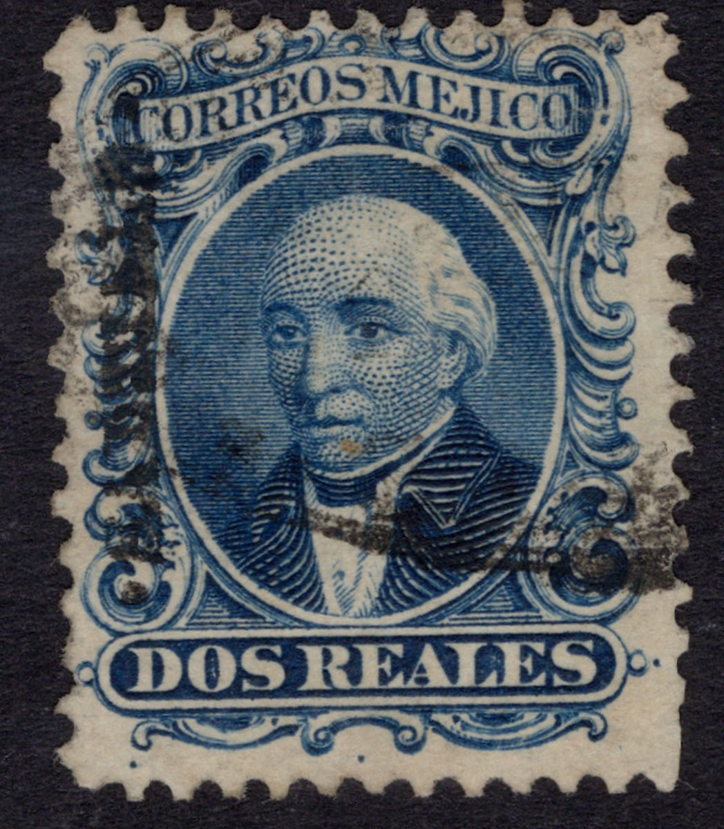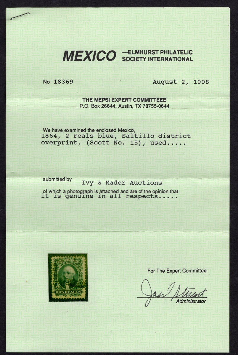 Saltillo 2r. Blue, a used example, centered to top left with perforations touching the design. A very attractive example of this extremely rare stamp, used with a light cancellation. This issue was the first to be perforated, printed in the United States by order of Benito Juárez. It saw brief use in July and August in Saltillo and Monterrey, during the period when Juárez moved his government to those cities. Most of the print run was delivered after Juárez regained control of the country but was never issued for postal use, instead entering the philatelic market and making non-overprinted examples common and inexpensive. However, stamps bearing district overprints, whether used or unused, are very scarce, with this denomination being the rarest in the set. 1974 and 1998 MEPSI certificate. Scott 15, $1,750.
