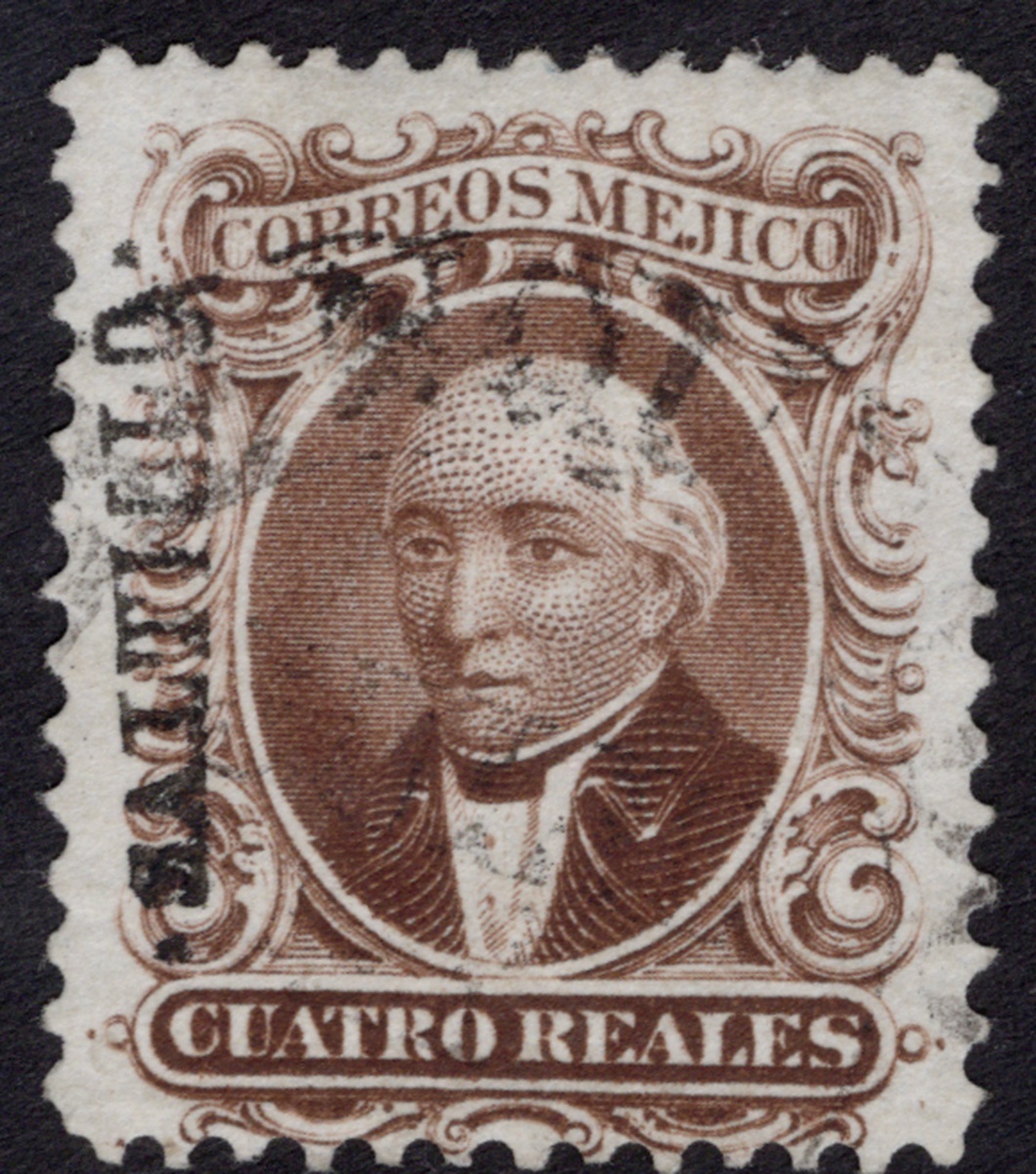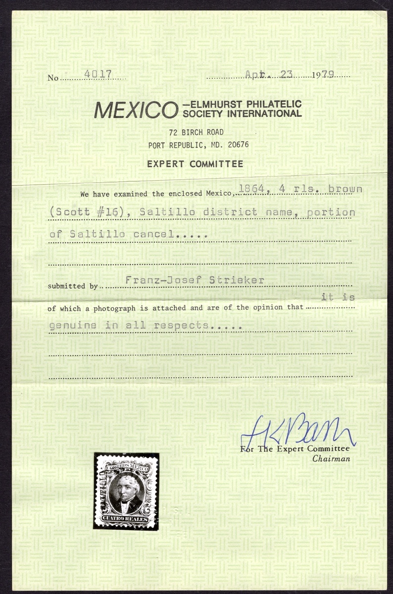 Saltillo 4r. Brown used. Centering is bottom with perforations touching the design as usual. Very attractive, fresh and extremely rare stamp with light cancel. This issue was the first perforated one and was printed in the USA and ordered by Benito Juárez. It was briefly used in July-August in Saltillo and Monterrey while Juárez moved his government to those cities. Most of the production was delivered after Juárez took control of the country, but was not used and reached the philatelic market, so it is abundant and inexpensive without district overprint. However overprinted stamps used or unused are very scarce. 1979 MEPSI certificate. Scott 16, $2,400; NF $3,000.