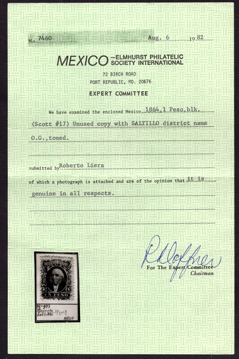 Saltillo 1p. Black, unused with original gum, centered toward the lower left, with perforations just touching the design at left. Slight toning along the left margin. An exceptionally rare stamp, displaying crisp detail and strong visual appeal, with only at most five examples recorded. This issue was the first to be perforated, printed in the United States by order of Benito Juárez. It saw brief use in July and August in Saltillo and Monterrey, during the period when Juárez moved his government to those cities. Most of the print run was delivered after Juárez regained control of the country but was never issued for postal use, instead entering the philatelic market and making non-overprinted examples common and inexpensive. However, stamps bearing district overprints, whether used or unused, are very scarce, with this denomination being the rarest in the set. Still accompanied by Fayol’s original inventory card #973. 1982 MEPSI certificate. Scott 17, $3,250.
