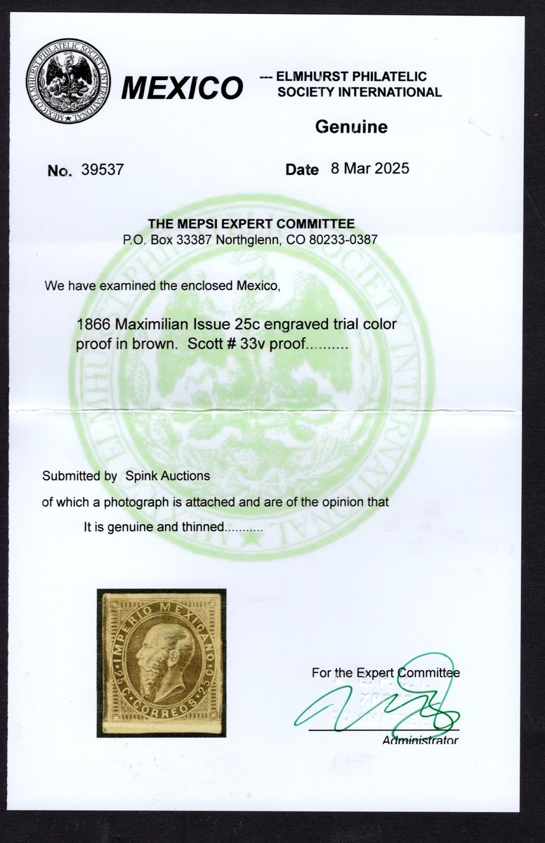 1866 25c. Engraved trial color proof in Brown. Thin spot, nevertheless a very rare proof. 2025 MEPSI certificate. Scott 33v.