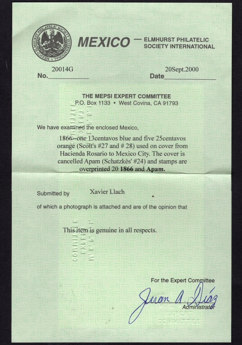 Apam Lithographed 13c. Blue, single, and 25c. Orange, five single examples (#20-1866), good margins, used on an outstanding entire letter to Mexico City dated August 20, 1866, tied to cover by circular h.s. of Apam. Most likely a unique combination paying $1.38 pesos. 2000 MEPSI certificate. Scott 27, 29.