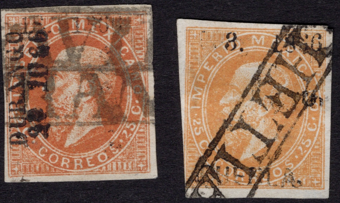 Durango, Puebla Duo of lithographed 25c. buff and orange examples, margins all around, including Durango (#18-1866 sub 29-1866) from Gavilanes, which, according to Roberto Liera, is the only sub-number recorded from that district: "...because the news of the Maximilian forces moving out did not reach this far-away town in the mountains of Sinaloa" (his handwritten note attached). The Puebla stamp (#3-1866 sub 5) from Chietla is also very rare, as this is a tiny town. Scott 28, 29.