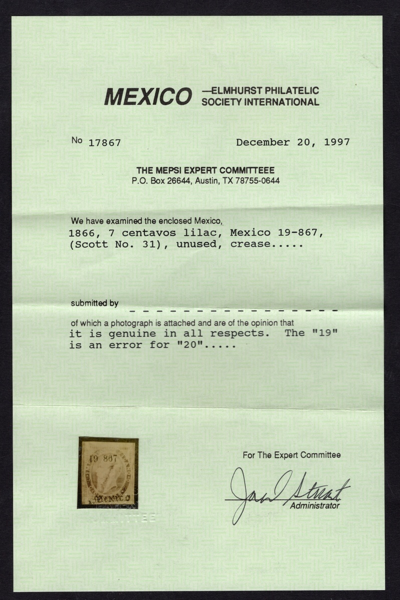 Mexico District 7c. Lilac Engraved (#19-867), unused without gum and displaying four large margins. Two tiny white thin dots and small crease. The "19" is an error for "20". 1997 MEPSI certificate. Scott 31, $450.