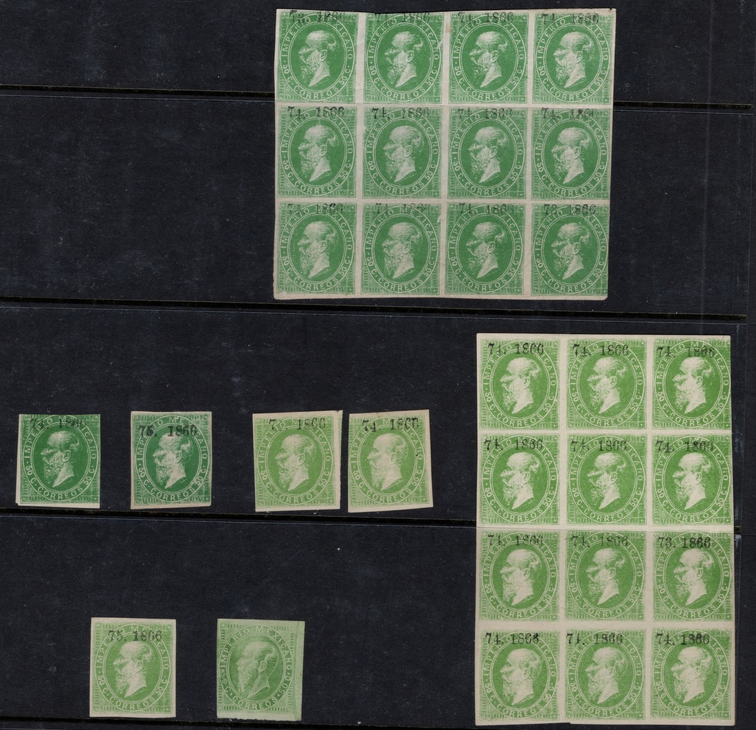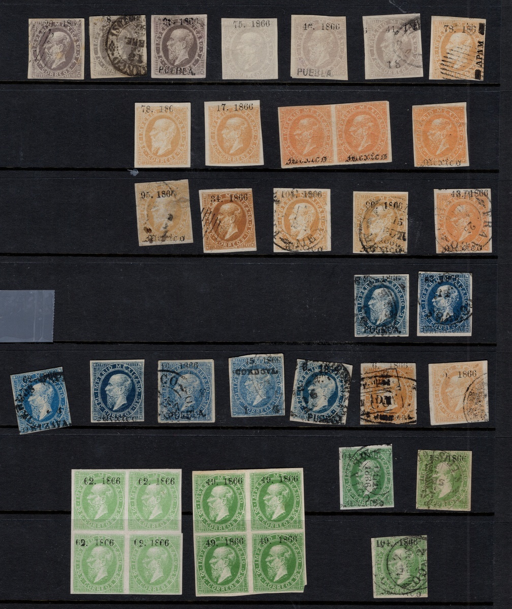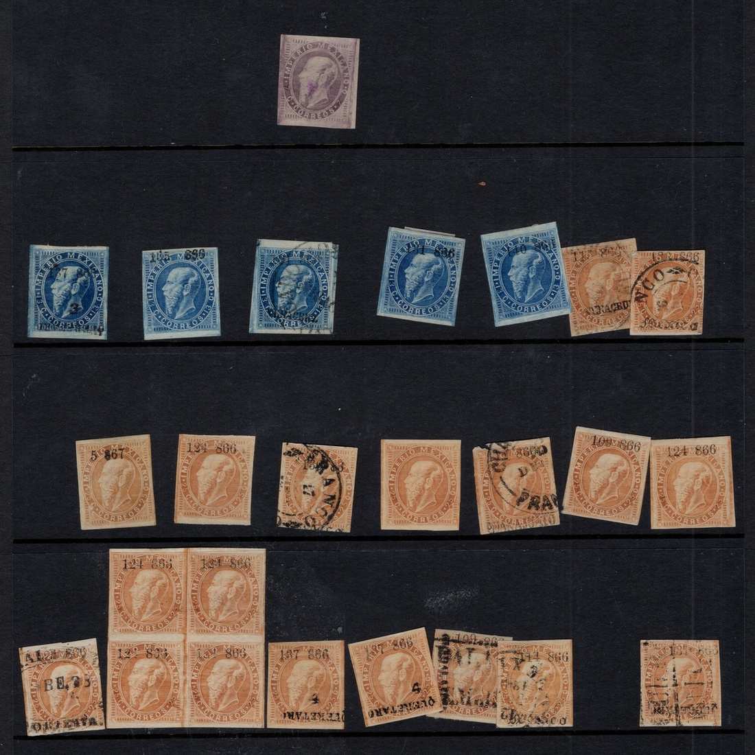Various districts Assembly of over 90 stamps, used and unused, including lithographed and engraved issues. The highlights being Litho: seven 7c. gray from Apam, San Luis Potosí, Puebla, and Guadalajara (two with sub-numbers), one with a MEPSI certificate; 13c. blue from Puebla, Guanajuato, Orizava, and Cordova; 25c. orange from Diligencias, Apam; 50c. from San Luis Potosí and Mexico, including unused blocks. The engraved issues include mostly 13c. blue and 25c. orange from Mexico, Querétaro, Orizava, and Guadalajara. Scott 26-30, 31a-34, $2,575.,