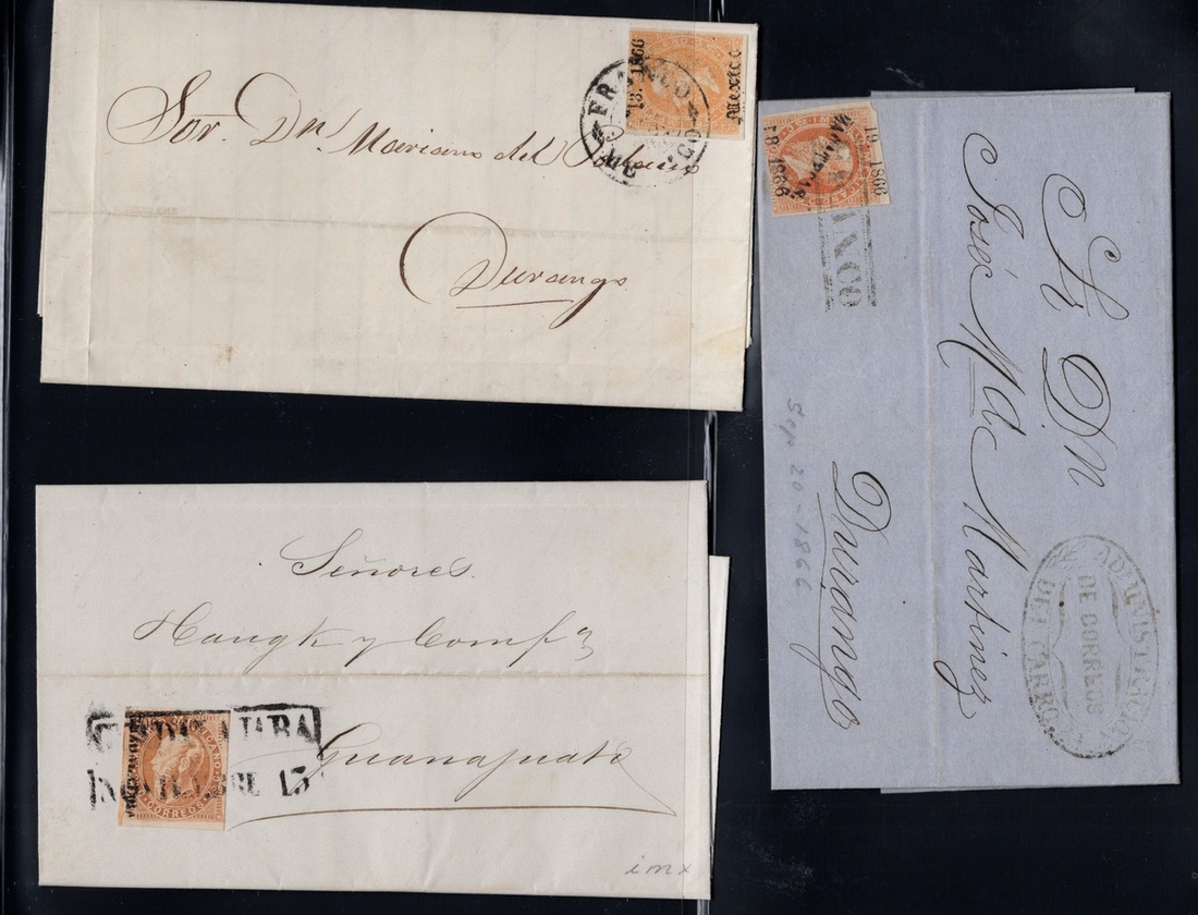 Various Districts Group of six attractive covers bearing lithographed or engraved 13c. Blue or 25c. Orange/Buff examples, with the 25c. including Zacatecas (Carro), Guadalajara, Mexico, Guanajuato, San Luis Potosí (one from Salinas). Most stamps bearing three or four margins. Scott 27, 28, 29, 33.
