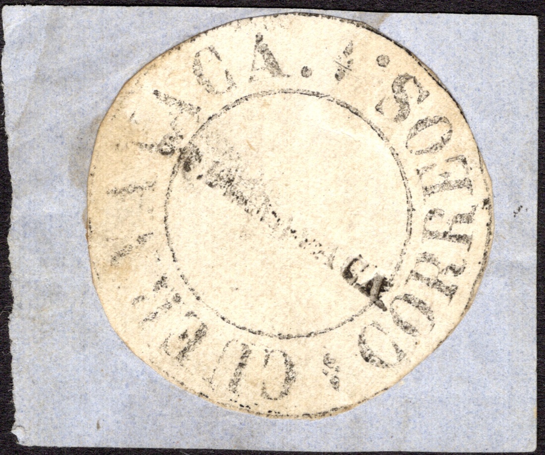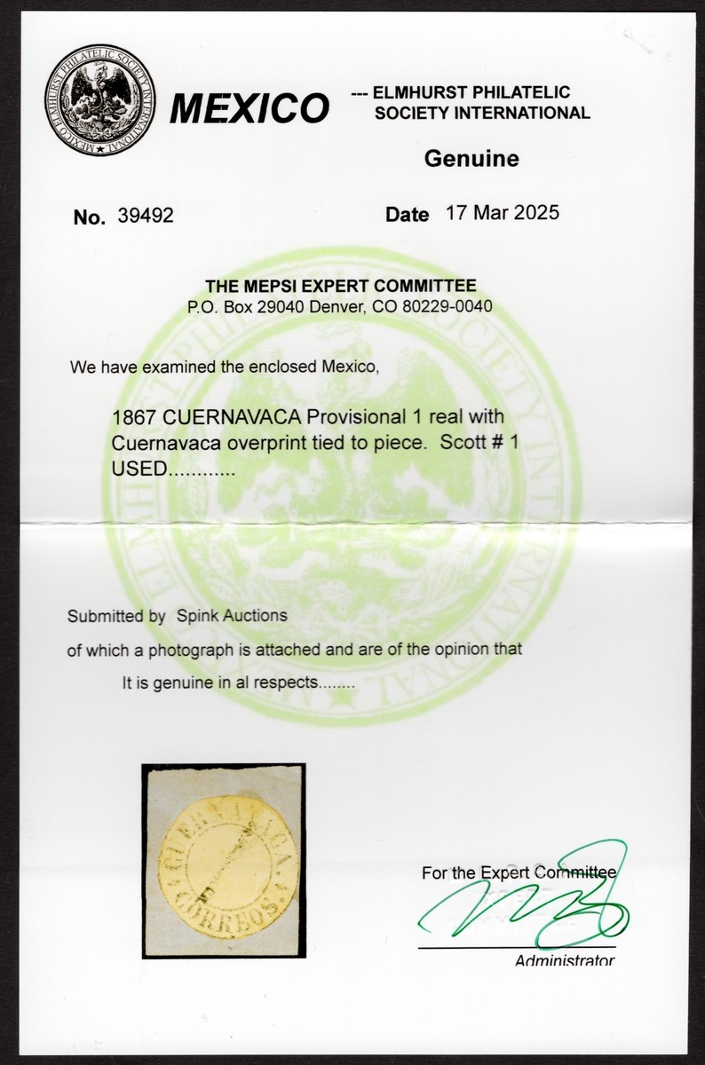 Cuernavaca Provisional 1r. Black, used on piece cut to shape. These Provisionals were prepared in urgency, with the cancellation applied directly onto plain white paper. They are not known unused and from the few covers known it is believed that the rate they paid was 1r. 2025 MEPSI certificate. Scott Cuernavaca 1, $1,750.
