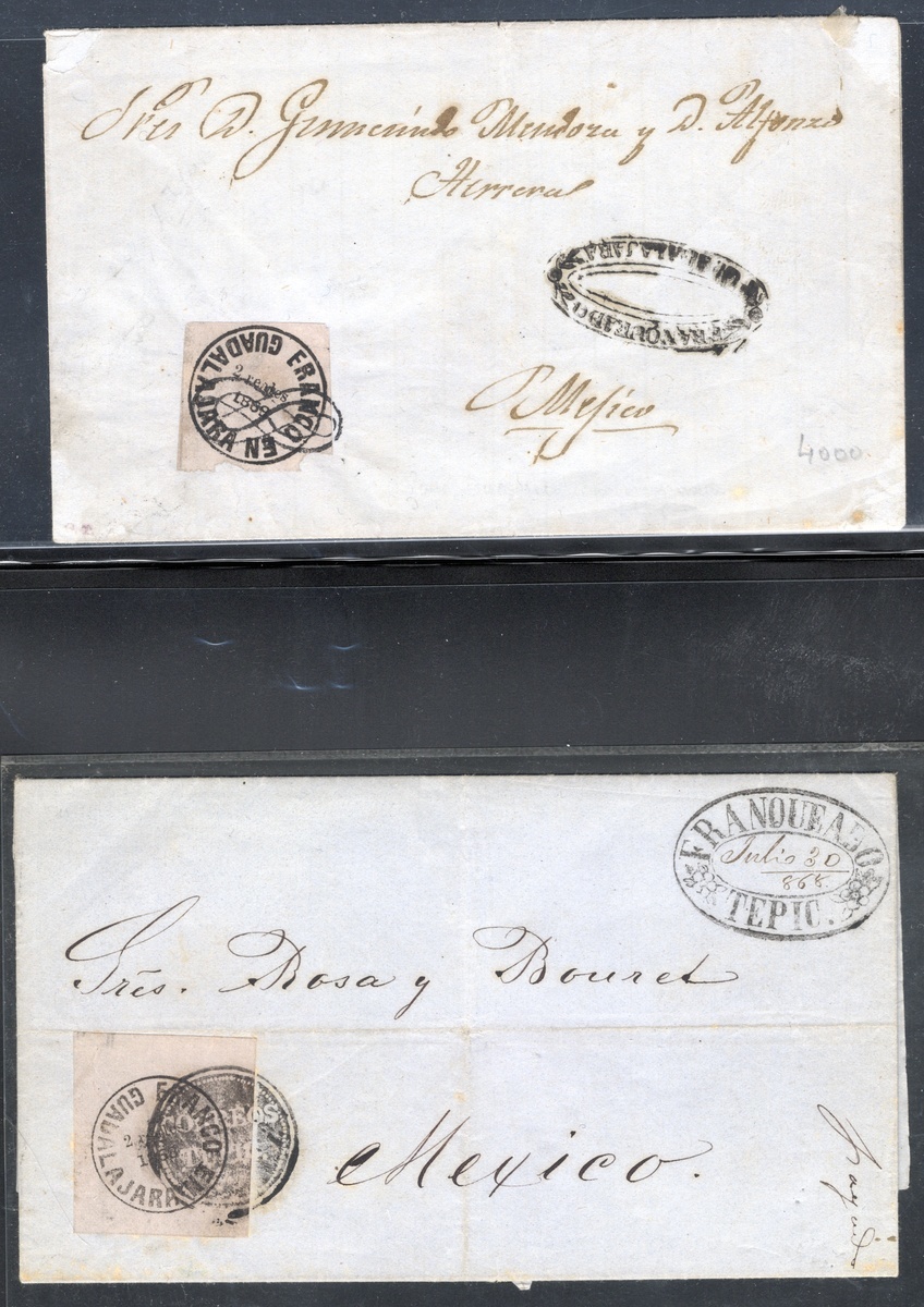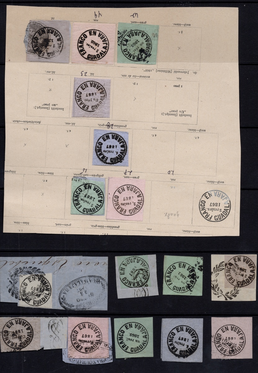 1867 Group comprising 16 stamps and two covers, with most stamps in used condition and the highlight being one 1r. White wove 1st Period on piece, used with a fantastic wreath cancel dated January 23, 1867 ($250). Among other better examples, we find the uncommon 1r. Green 4th Period on Laid Paper, variety "1863" for "1868" (Scott $300), a very bright and fresh 2r. Rose 4th Period unused (almost looks like white). The 1868 cover from Tepic is very attractive, displaying a lovely cancel. Scott Guadalajara 4, 13,15, 20, 23, 25-28, 38, 42, 47c, 49, $800 for off cover singles., ,