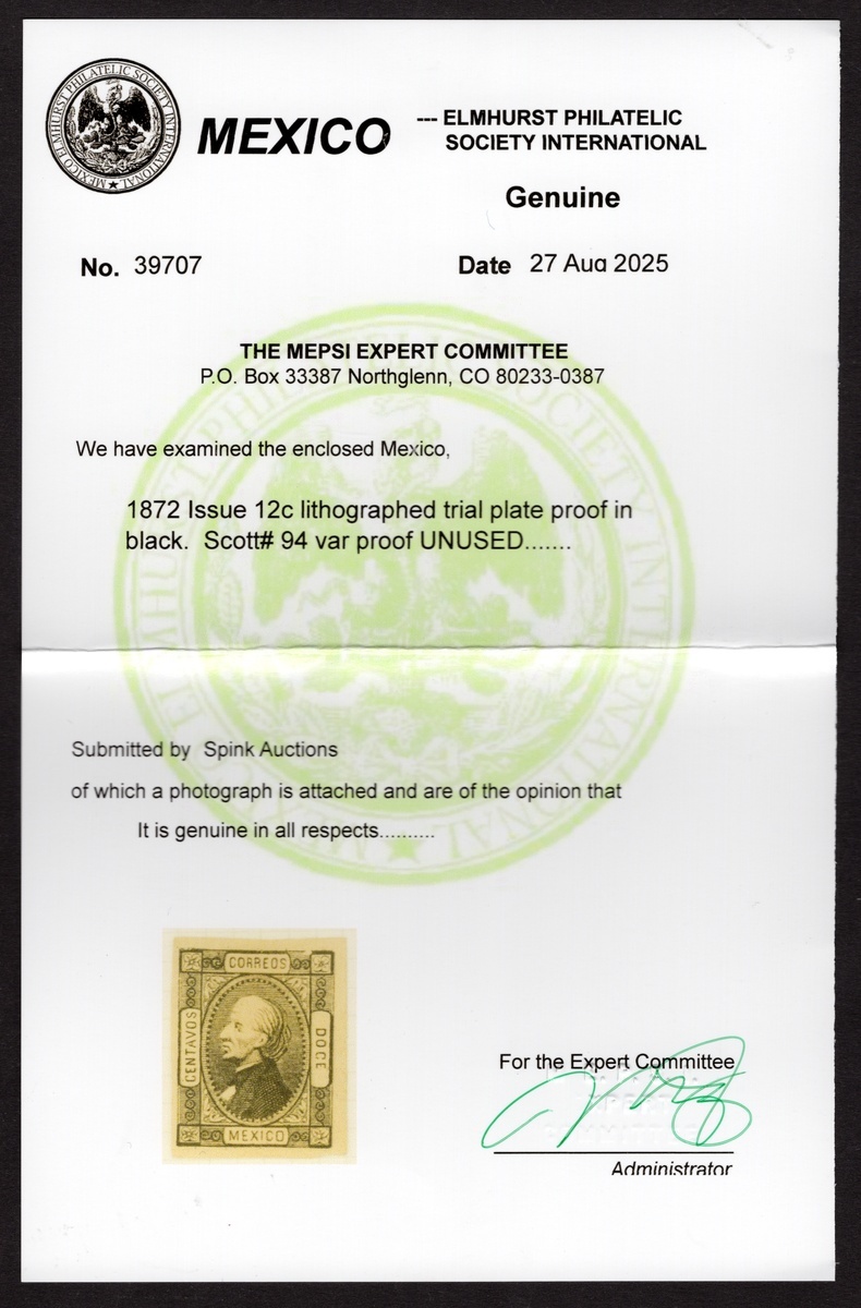 Trial Plate Proof 12c. Black lithographed on white wove paper, four ample margins. Thin spot not detracting from this extraordinarily rare proof. 2025 MEPSI certificate. Scott 94 var.