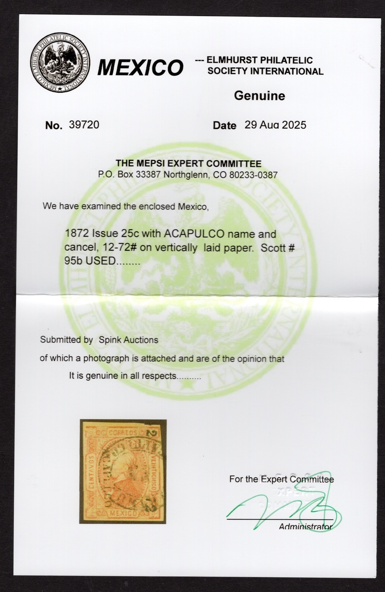 Acapulco 25c. Red (#12-72) on vertically laid paper, used, complete margins all around. 2025 MEPSI certificate. Scott 95b, $500.