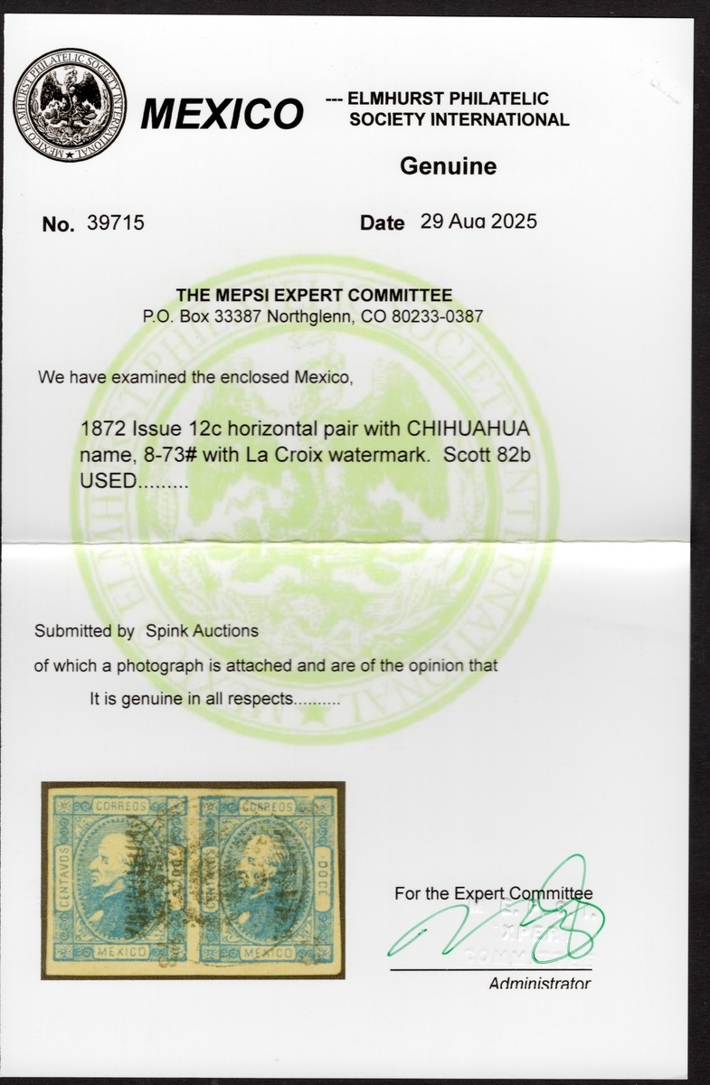 Chihuahua 12c. Blue pair (8-73), imperforate, "La Croix Frères" watermark, clear margins all around, in used condition. 2025 MEPSI certificate. Scott 82b, $650.