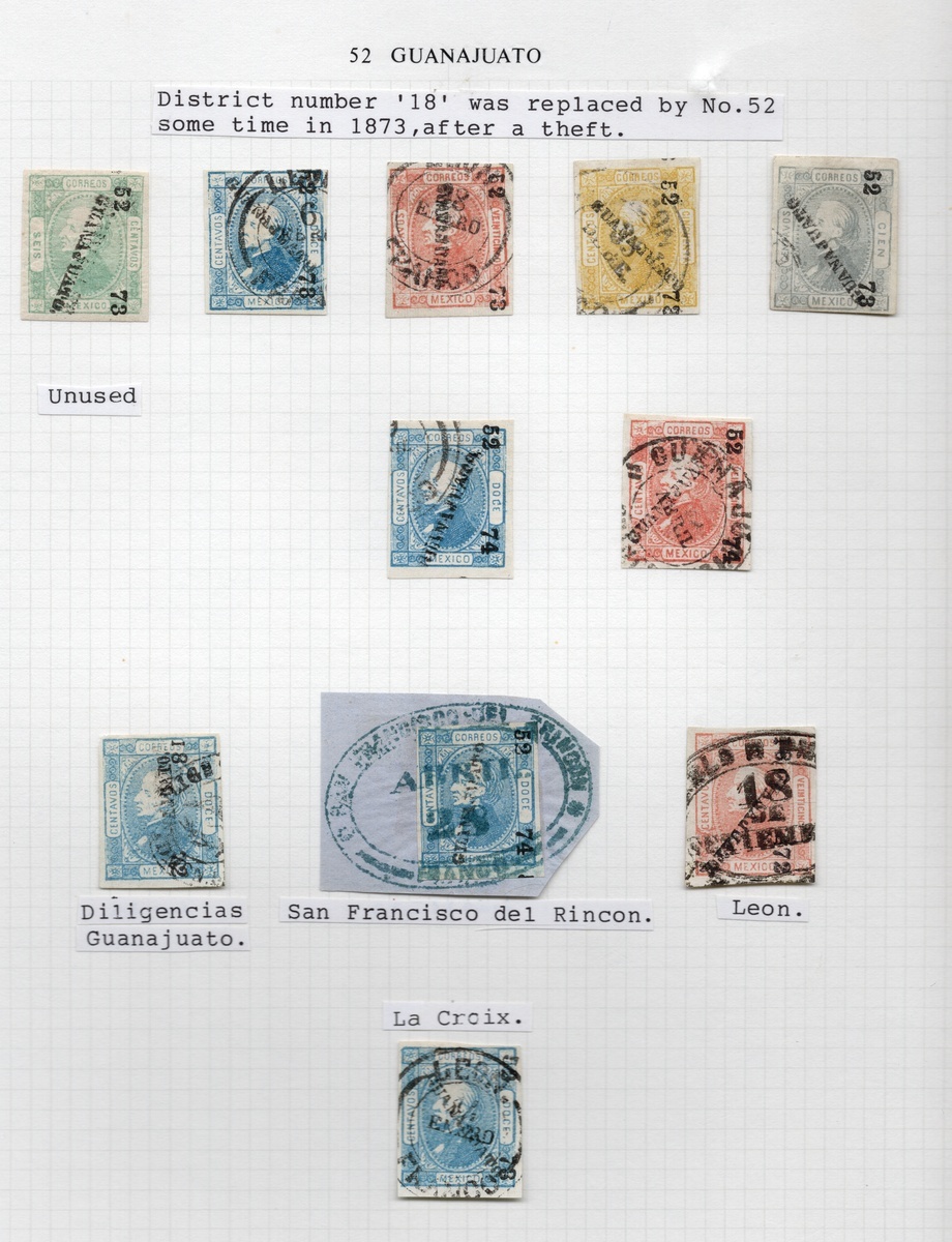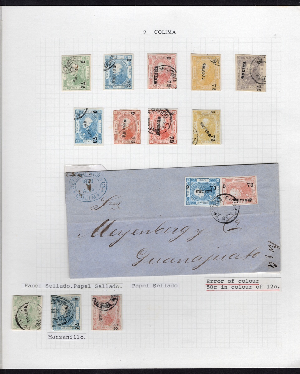 Colima, Guanajuato Group of 23 stamps (used and unused) plus one cover, all neatly mounted on presentation pages (Consignments #9 and #52), with different consignment years 1872-74 each in a row, with no duplication. The stamps range from 6c. to 100c. and include four examples with the “Papel Sellado” or “La Croix Frères” watermark. Notably, a 12c. Blue with “Papel Sellado” watermark is cancelled at the tiny port of Manzanillo. Many stamps exhibit three or four margins. The cover, an attractive Colima to Guanajuato usage (#9-73), has a minor folding crease that does not affect the stamps. Scott 81-83, 82b, 93-96, 98; NF and Scott (for watermarked stamps) is $1,178 for stamps off cover., ,