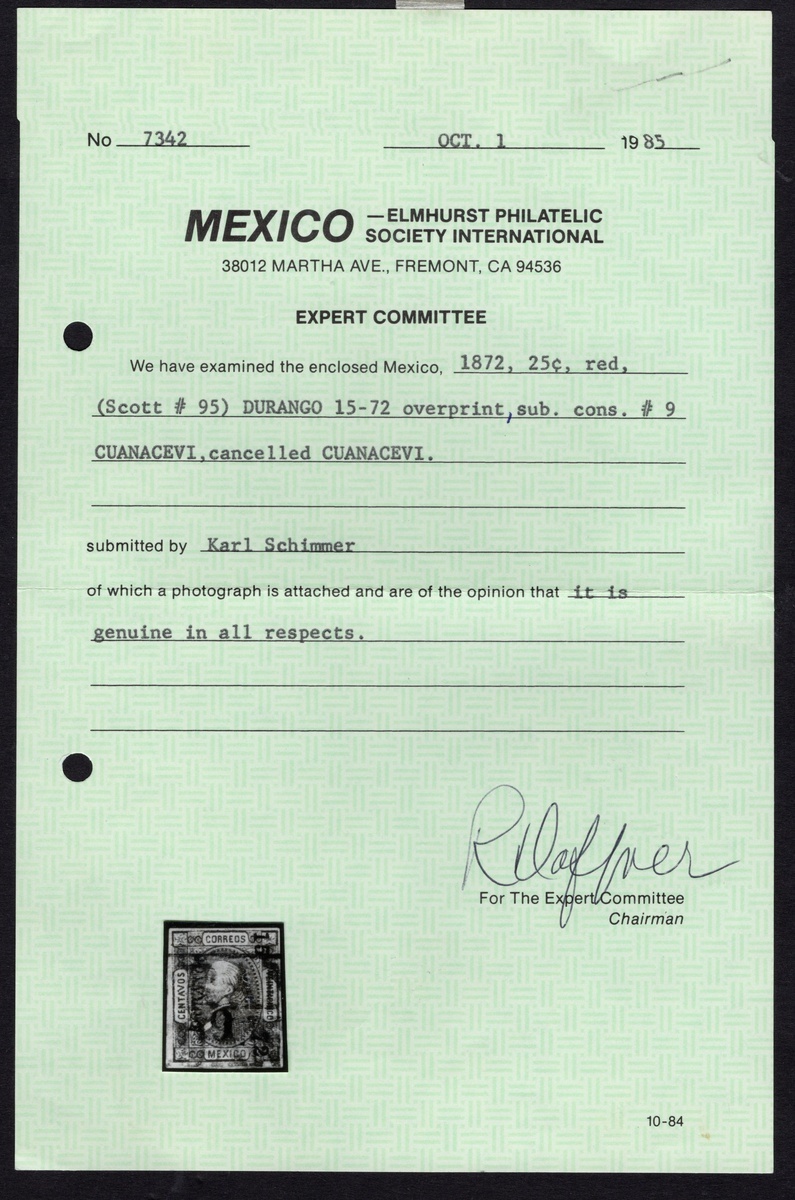 Durango-Guanacevi Sub # 9 25c. red (#15-72), imperforate, bearing the rare sub #9 from Guanaceví, good margins all around and in used condition; thin spots. Durango is the only district that applied additional sub-office number overprints to twelve suboffices for a brief period, from September 1872 to May 1873; these are very rare, with or without faults. 1985 MEPSI certificate. Scott 95 var; NF $300.