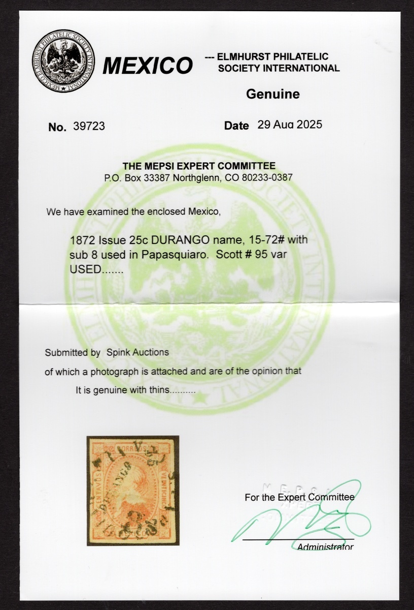 Durango-Papasquiaro Sub # 8 25c. Red (#15-72), imperforate, showing the rare sub-type #8, with margins all around and used; surface scuff and diagonal crease, but very scarce. Durango is the only district that applied additional sub-office number overprints to twelve suboffices for a brief period (September 1872-May 1873), all being very rare. 2025 MEPSI certificate. Scott 95 var; NF $250.