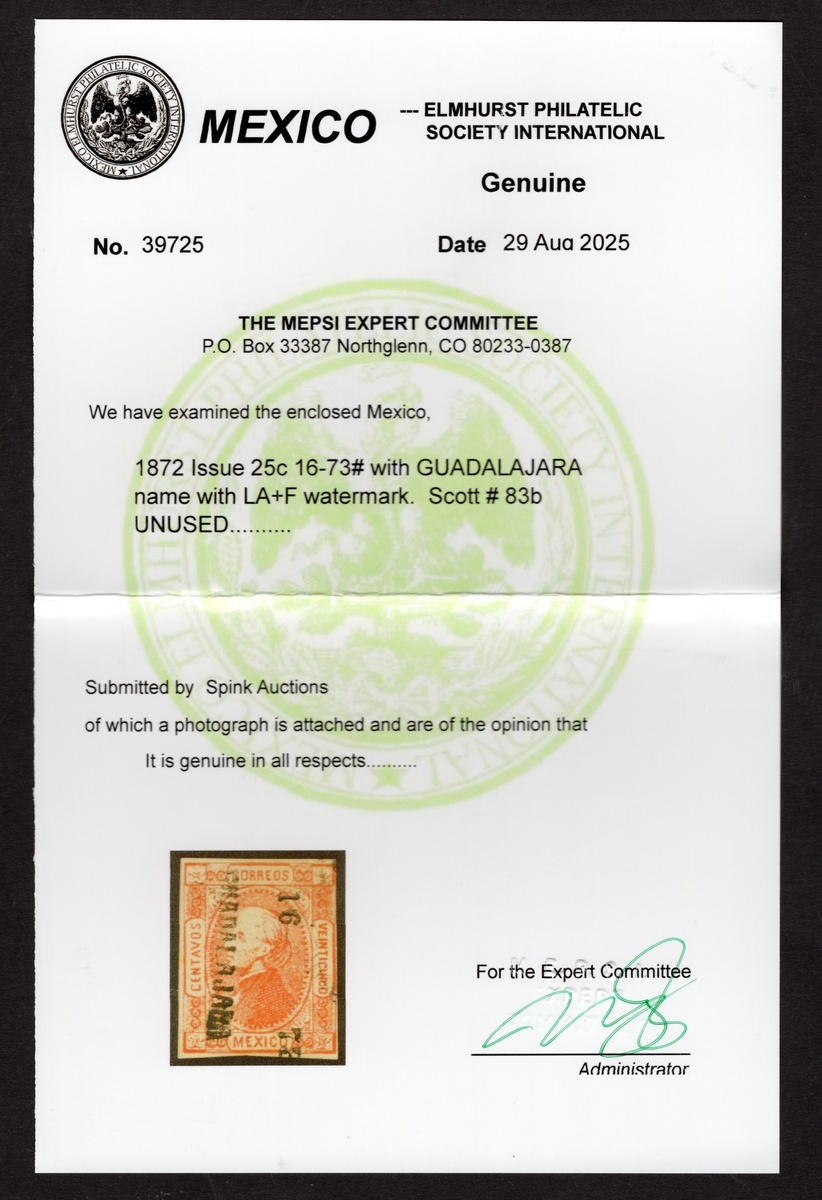 Guadalajara 25c. Red (#16-73), imperforate with "La Croix Frères" watermark, unused with margins all around (one close at right). 2025 MEPSI certificate. Scott 83b, $575.