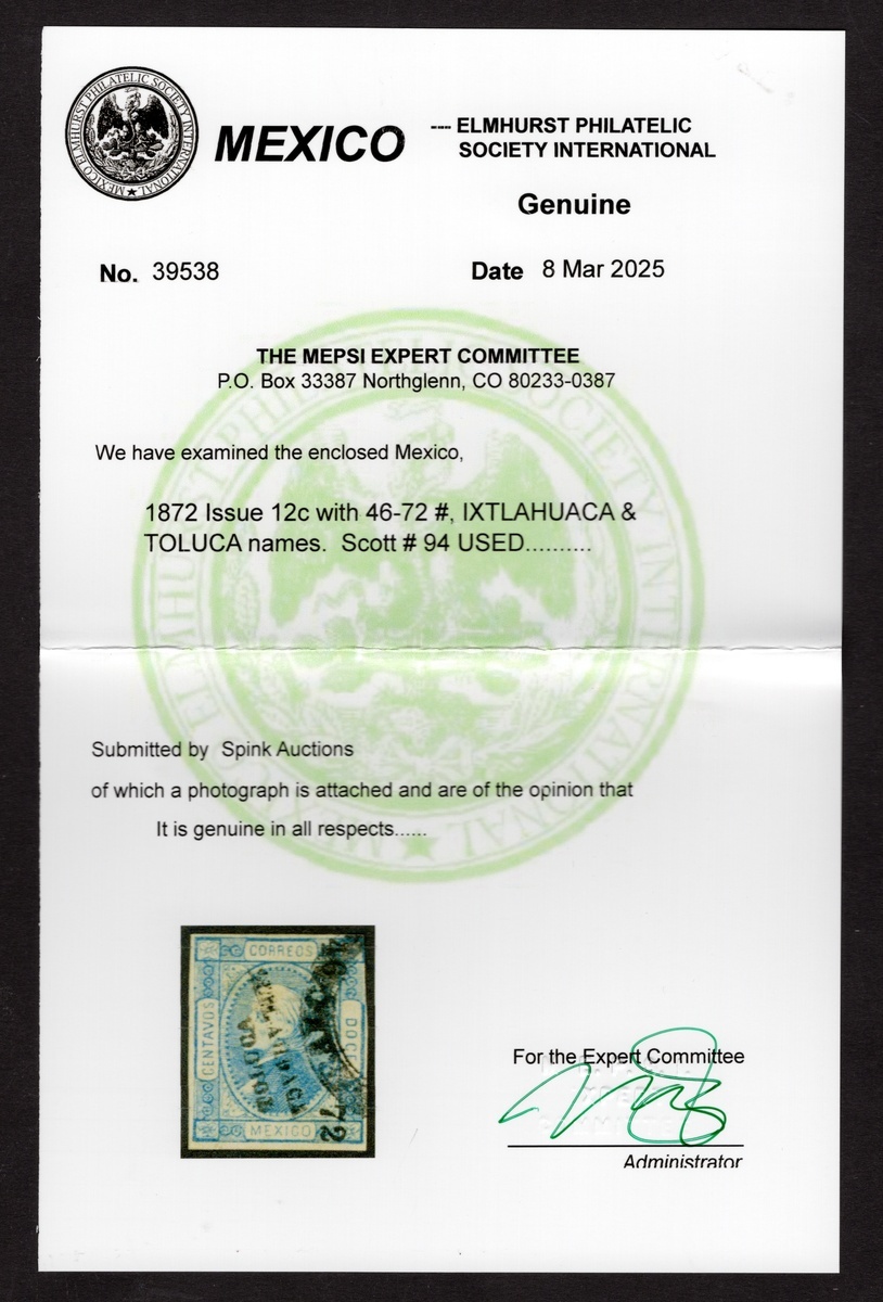 Ixtlahuaca and Toluca 12c. Blue imperforate (#46-72), margins all around, tight at right, used and on piece with probably Ixtlahuaca postmark. This appears to be an "Habilitado" (a stamp bearing a second overprint beside an earlier one). A highly uncommon example, as Ixtlahuaca was not an independent district at the time of this issue. It is likely that the stamp was originally sent from Toluca, and that the Ixtlahuaca postmaster mistakenly applied an outdated overprint. 2025 MEPSI certificate. Scott 94; unlisted by NF.