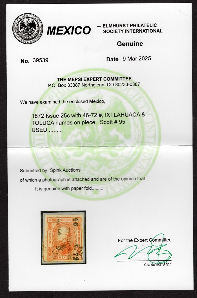 Ixtlahuaca and Toluca 25c. Red imperforate (#46-72), with full margins, used on piece and bearing a handstamp, likely from Ixtlahuaca. This appears to be an "Habilitado" (a stamp with a second overprint applied beside a previous one). Paper fold not detracting from this very rare usage, as Ixtlahuaca was not an independent district during this issue. It is likely the stamp was sent from Toluca and mistakenly overprinted by the Ixtlahuaca postmaster using an older handstamp. 2025 MEPSI certificate. Scott 95; unlisted by NF.