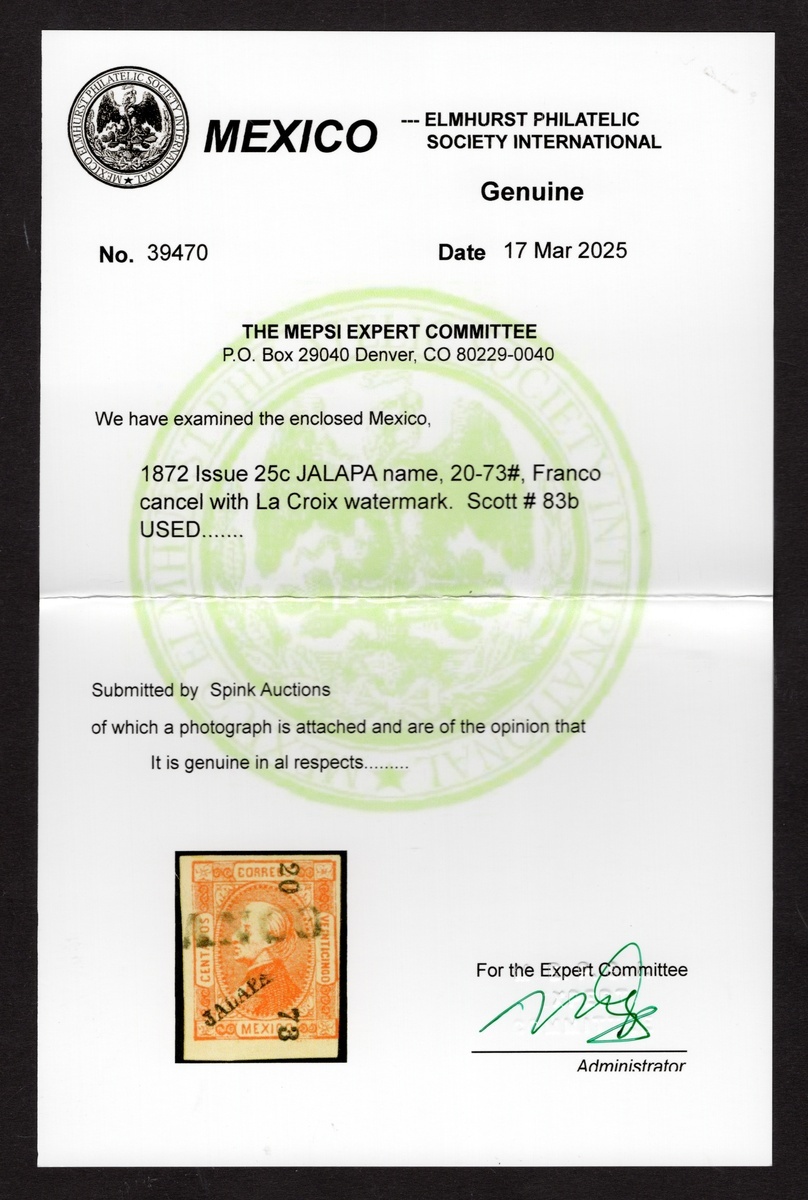 Jalapa 25c. Red (#20-1873), a used example with "La Croix Frères" watermark, four good margins. 2025 MEPSI certificate. Scott 83b, $575.
