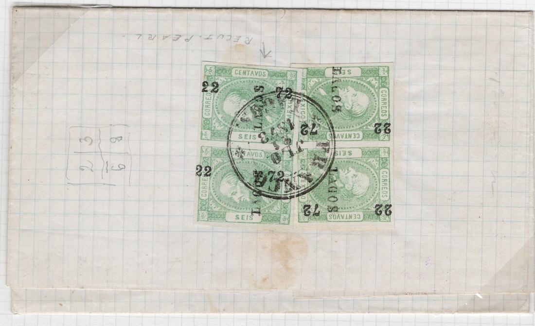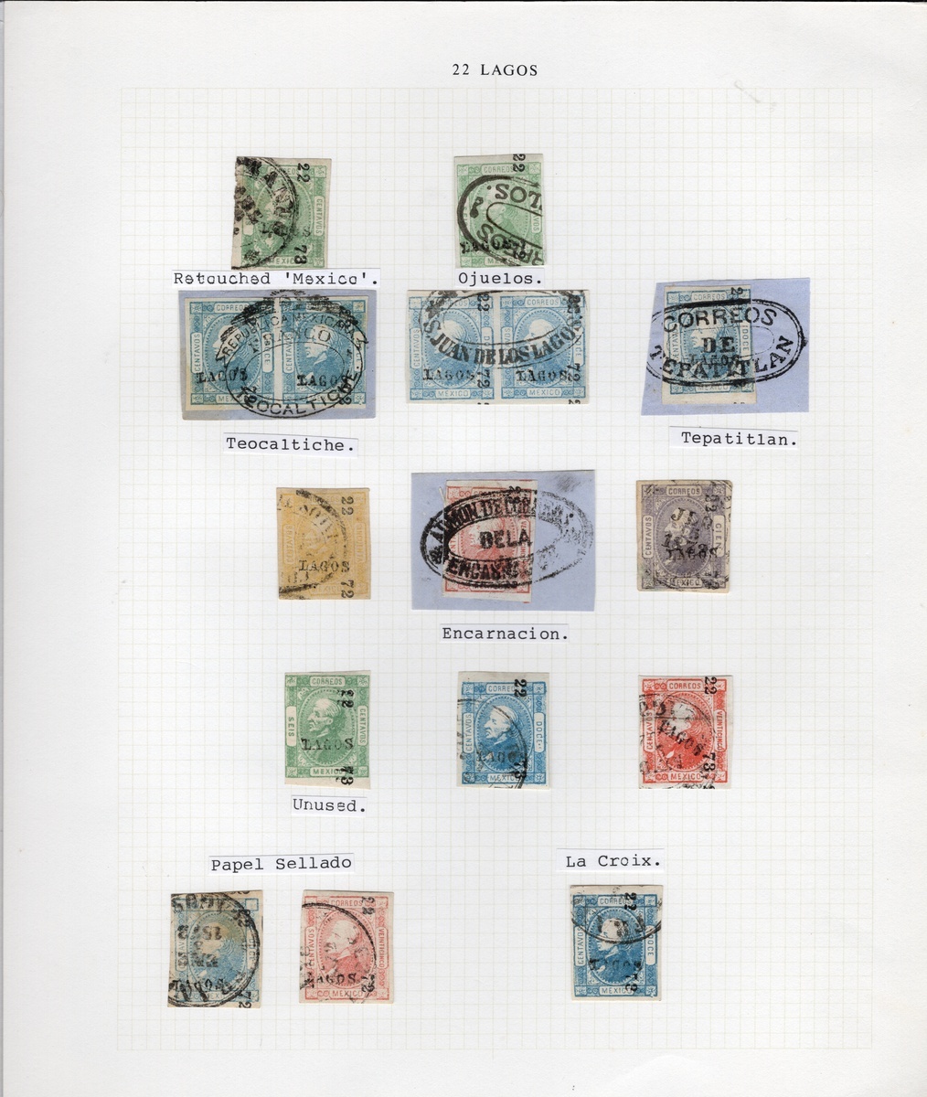 Lagos Group of 16 mostly used (one unused), imperforate stamps, and one cover with an unusual franking featuring two pairs of 6c., appearing as one block, untied to the cover. The singles are neatly mounted on presentation pages (consignment 22) with different consignment years 1872–74, each in a row, with no duplication. Featuring all denominations from 6c. to 100c., as well as two stamps with "Papel Sellado" watermark (one with a thin). Additionally, there is one stamp identified as a possible "La Croix" watermark (not counted as such). Cancels include Lagos, Ojuelos, Teocaltiche, San Juan de los Lagos, Tepatitlán, and Encarnación. Very good condition overall, many with three or four clear margins. Scott 82, 83, 93-96, 98; NF and Scott (for watermarked stamps) is $ 587 for stamps off cover., ,