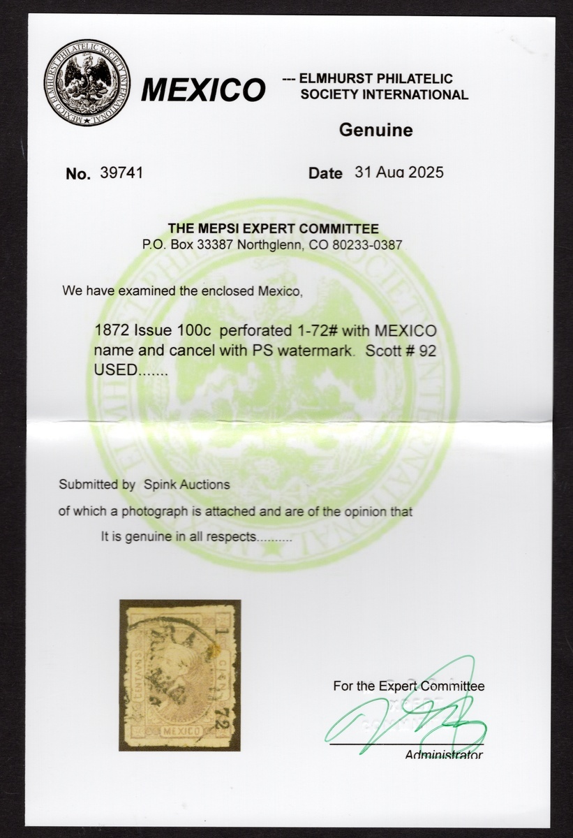 Mexico District 100c. Gray (#1-72), perforated, with "Papel Sellado" watermark, margins close with the design nearly touched at right and left, used. 2025 MEPSI certificate. Scott 92, $1,200.