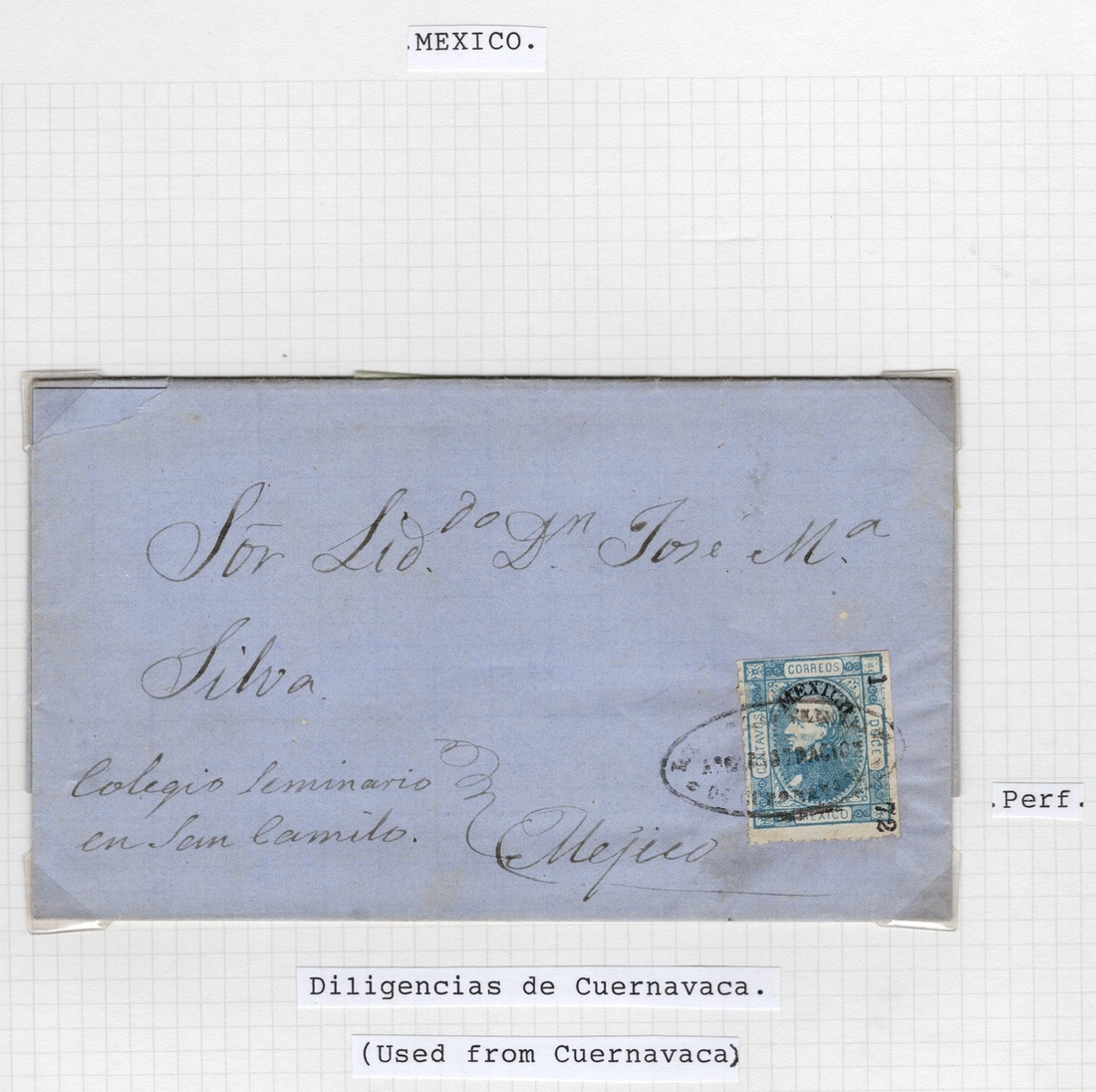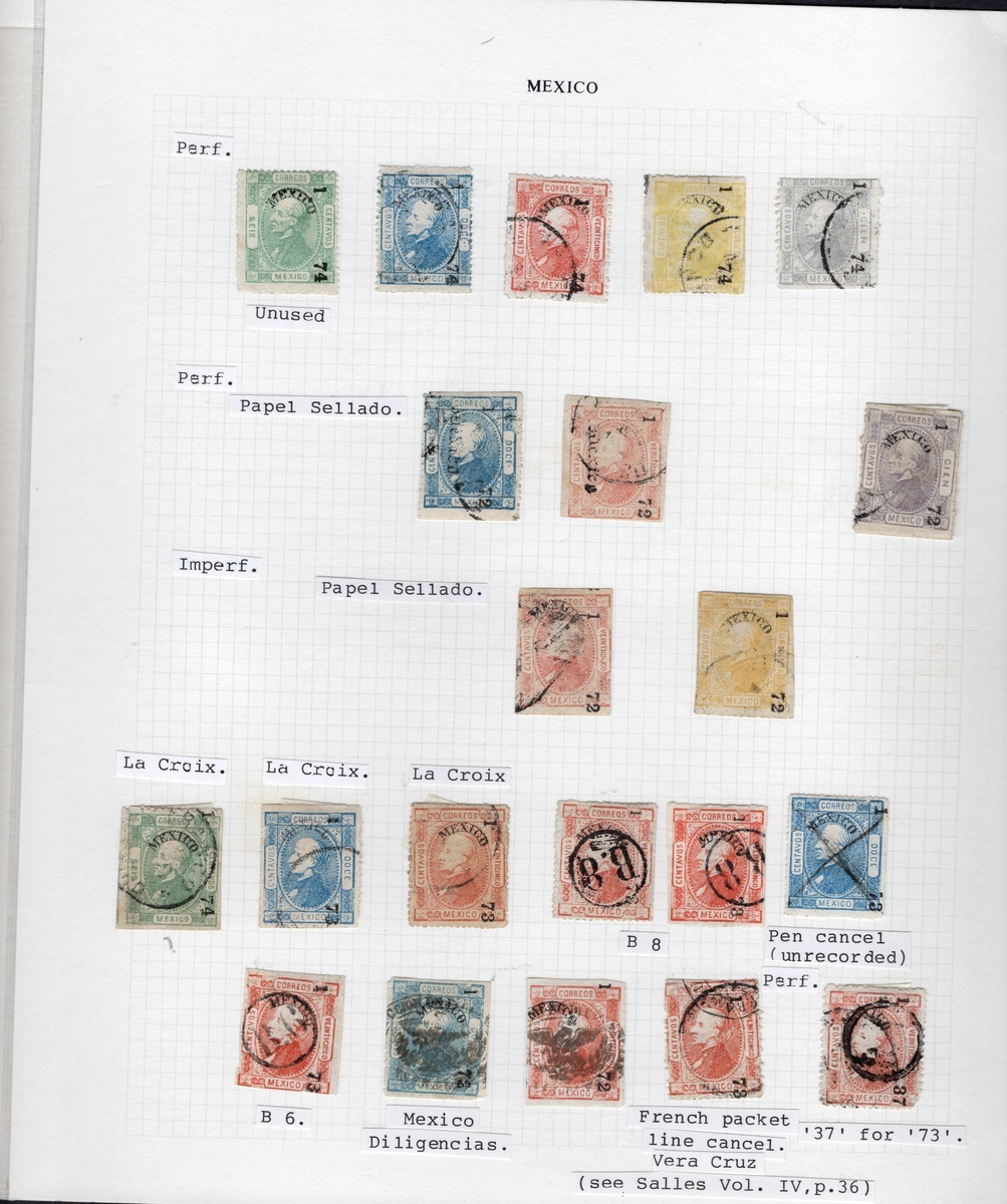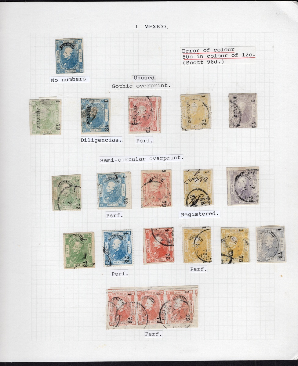 Mexico District Assembly comprising 41 mainly perforated stamps and three covers (incl. one with a rare "Diligencias de Cuernavaca" h.s.). The stamps, largely used, are neatly mounted on presentation pages (consignment 1) with different consignment years (1872–74) and without duplication. This display includes all denominations from 6c. to 100c., as well as eight examples bearing the "Papel Sellado" or "La Croix Frères" watermarks. Both Gothic and semicircular overprints are represented, along with a scarce 13c. Blue showing no consignment numbers. Notable cancels include "Certificado" and "B" (buzón/drop mailbox), and there is a consignment error "37" for "73". In predominantly very fine condition, mainly showing good margins. Scott 83, 84, 87a, 88, 88a, 89, 89a, 92, 94 var, 95, 96, 98, 99-102, 104; NF and Scott (for watermarked stamps) is $ 6,073 for stamps off-cover., ,