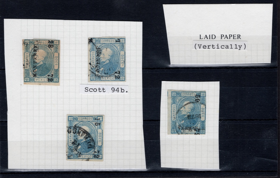 Monterrey, Mexico, Veracruz, Durango Group of four 12c. Blue (#1, 15, 28, 50-72) on vertically laid paper, used, showing two clear margins and one or two being close or touching. All scarce. Scott 94b, $840.