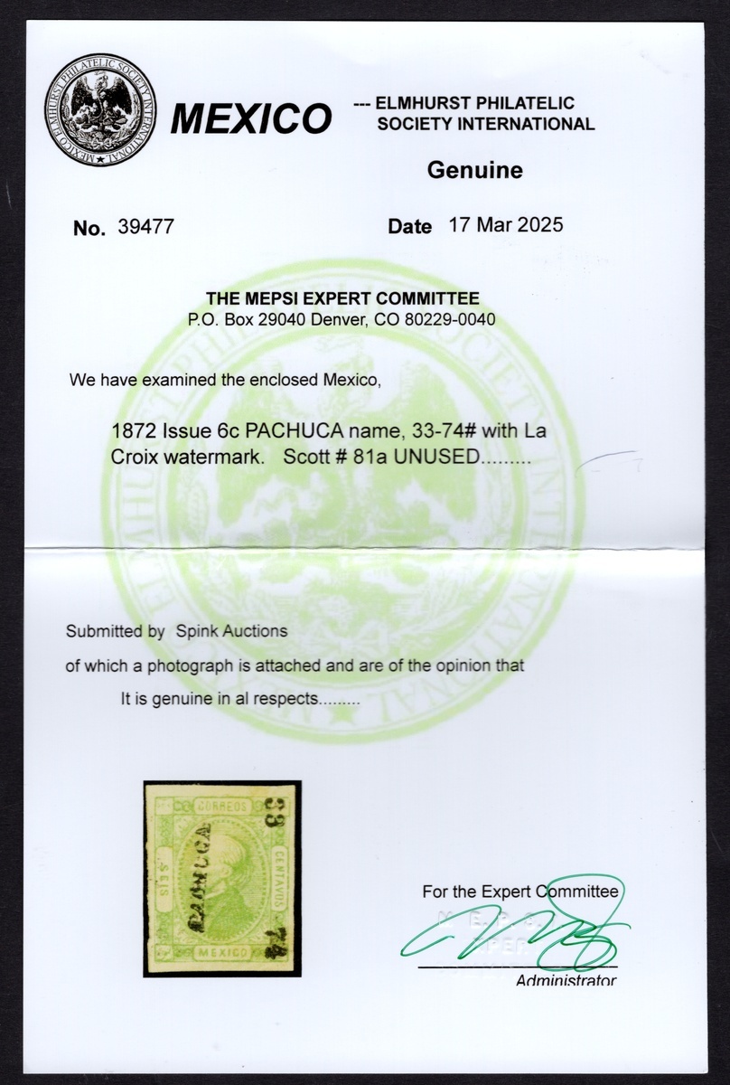 Pachuca 6c.Green (#33-1874), unused imperforate with "La Croix Frères" watermark, good margins all around and o.g. 2025 MEPSI certificate. Scott 81a, $ 2,000.