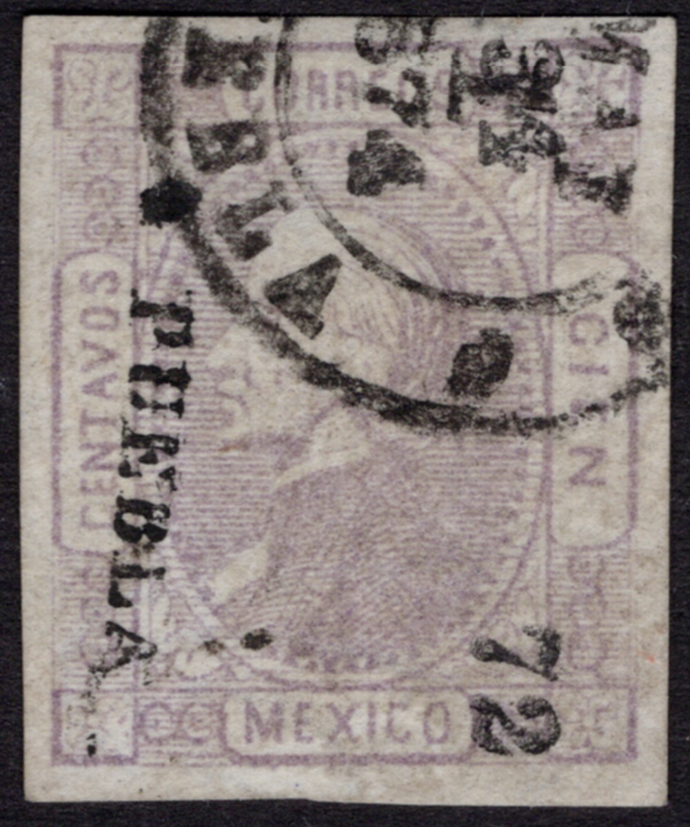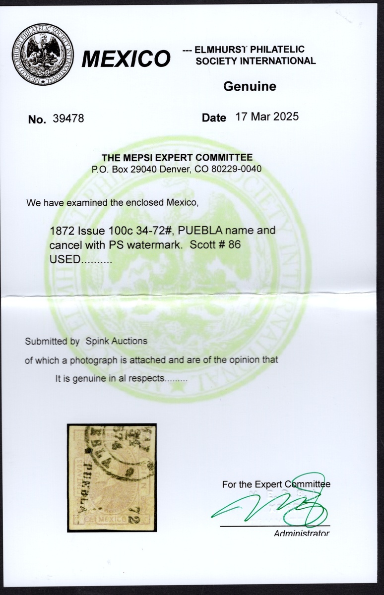 Puebla 100c. Gray Lilac (#34-72), imperforate used with c.d.s. "Papel Sellado" watermark, margins all around. 2025 MEPSI certificate. Scott 86, $650.