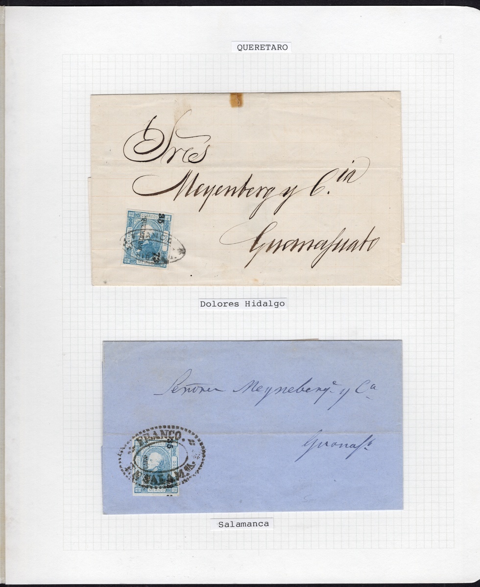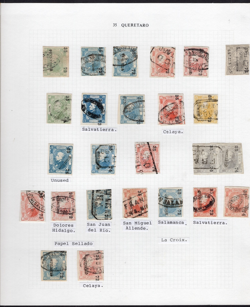 Querétaro Group of 25 imperforate stamps mostly used and two pristine covers neatly mounted on presentation pages (consignment # 35) with different consignment years 1872-74 each in a row, with no duplication. Stamps include 6c.-100c., as well as two "Papel Sellado" watermarks. There are cancels from Querétaro and several small towns: Salvatierra, Dolores Hidalgo, San Juan del Río, San Miguel de Allende, Salamanca, Celaya. The covers are from Dolores Hidalgo and Salamanca are tied with very attractive cancels. Scott 82-83, 93-96, 98; NF and Scott (for watermarked stamps) is $460 for off cover stamps., ,