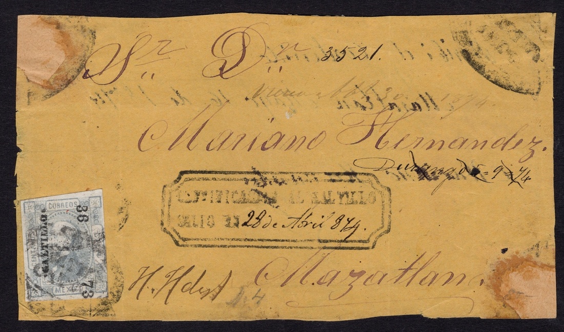 Saltillo District 100c. Gray Lilac imperforate (#36-73), slightly cut into at right, otherwise good margins, tied by two faint h.s. to registered cover front from Saltillo to Mazatlán on April 28, 1874. Postal rules required the recipient to sign the front of registered mail as proof of receipt, after which it was sent back to the originating office and destroyed two years later, with this explaining why so few examples remain today. Scott 98.