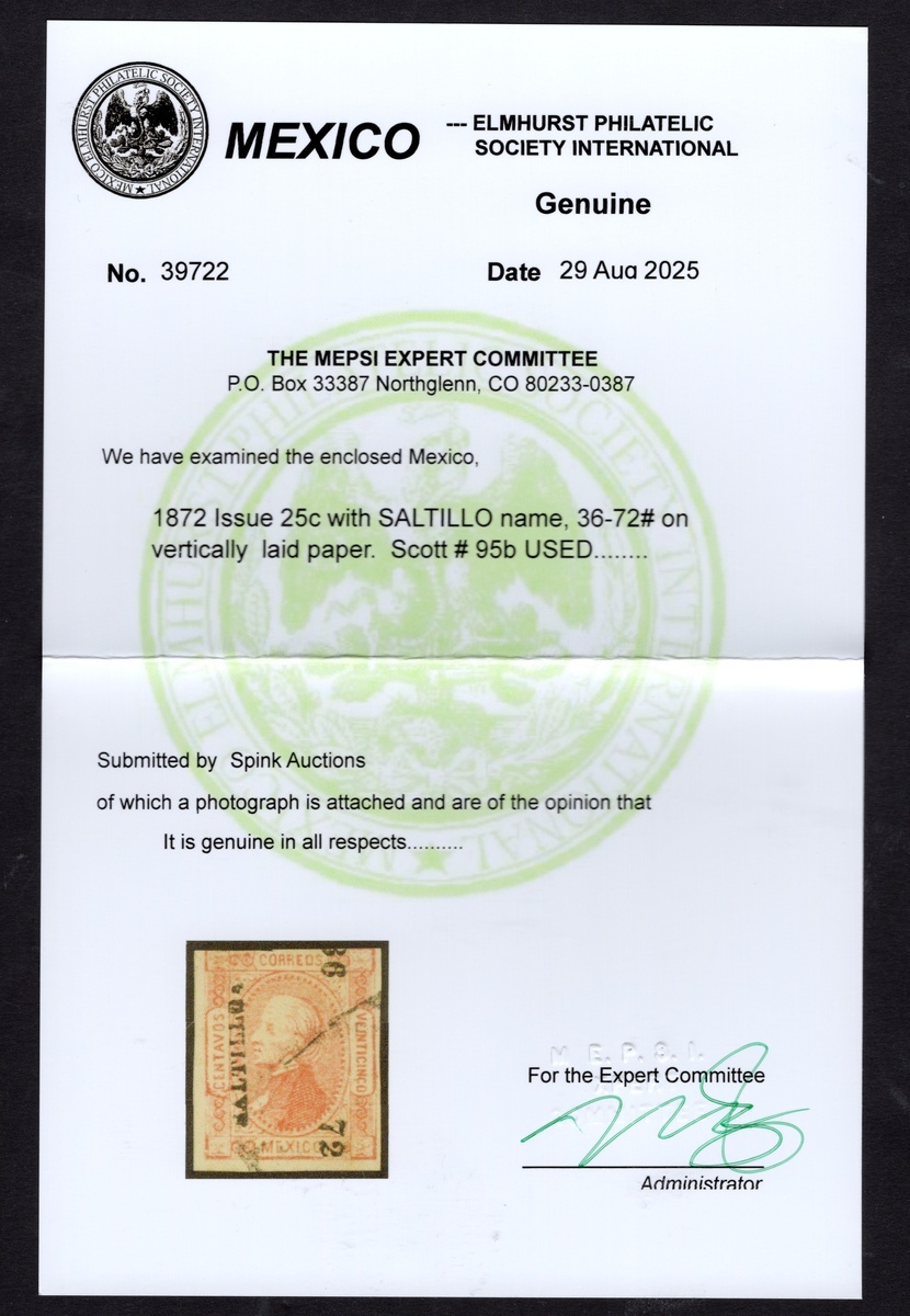 Saltillo 25c. Red (#36-72) on vertically laid paper, cut into at top, otherwise good margins, used. 2025 MEPSI certificate. Scott 95b, $500.