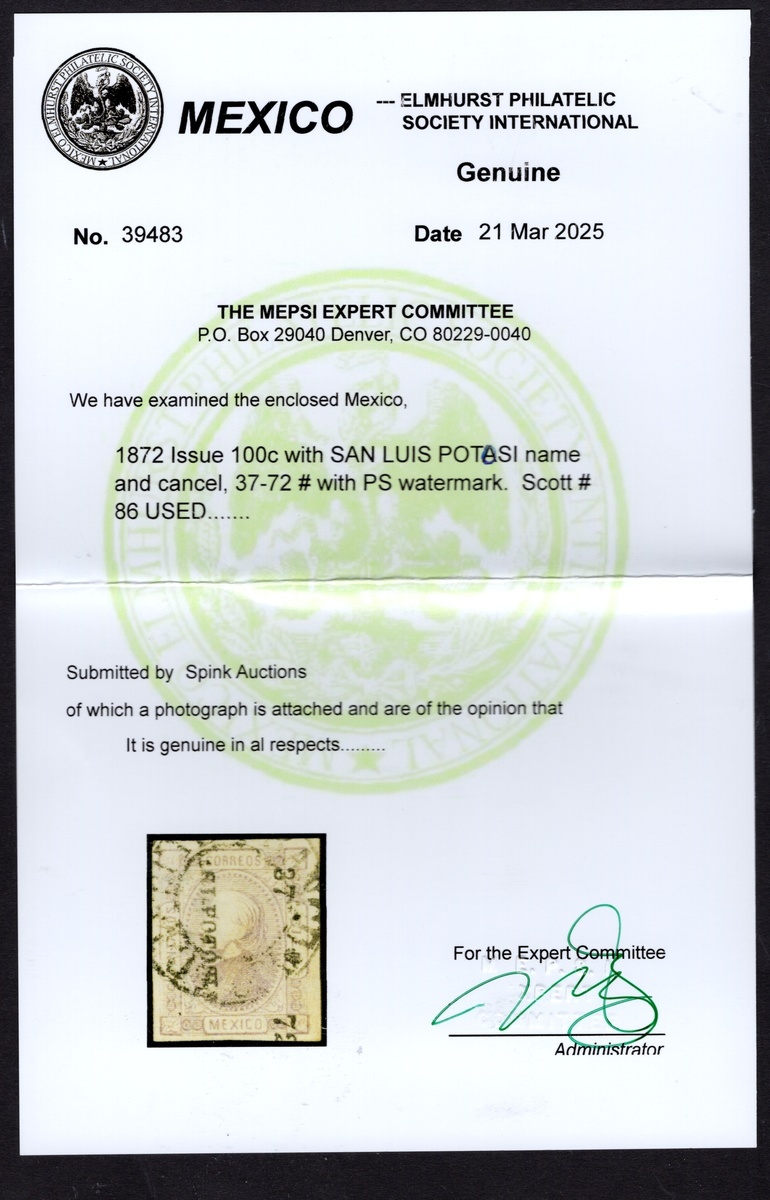 San Luis Potosí 100c. Gray Lilac imperforate (#37-72), a used example with "Papel Sellado" watermark and c.d.s., margins all around, small thin. 2025 MEPSI certificate. Scott 86, $650.