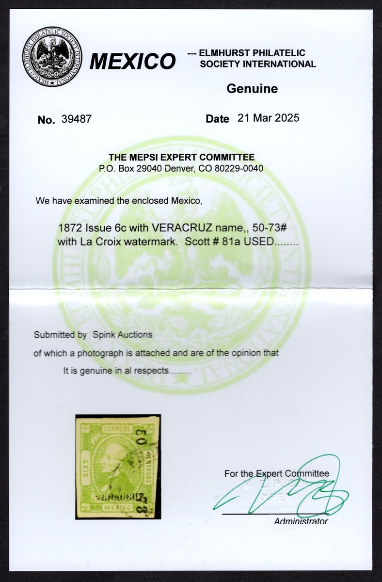 Veracruz 6c. Green (#50-73), imperforate used with "La Croix Frères" watermark, margins all around. 2025 MEPSI certificate. Scott 81a, $1,000.