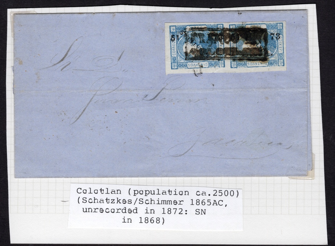 Zacatecas Two covers from the small towns Ojo de Agua and Colotlán (both #51-73), one bearing 25c. Red imperforate with neat Ojo Caliente h.s. tied to a pristine entire letter to Mexico City dated August 21, 1873; the other, to Zacatecas, is franked by 12c. vertical imperforate pair, untied, with cancellation heavily inked but being unrecorded for this issue. This town had a population of just 2,500 inhabitants. Scott 94, 95.