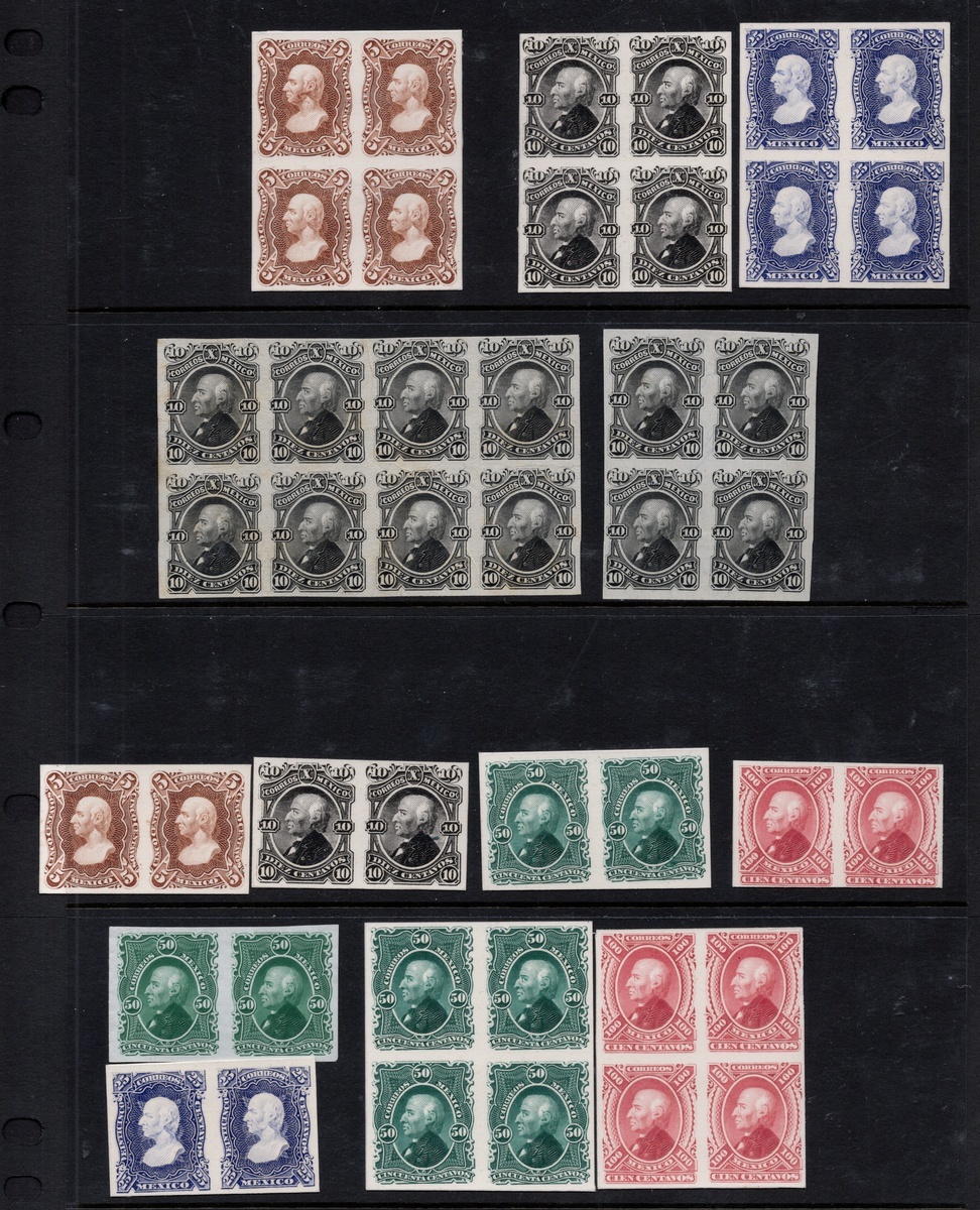 1874 Assembly comprising 44 imperforate proofs from 5c. Brown to 100c. Carmine, printed on card and on India paper in in the issued colors, including pairs and blocks of four of all the denominations (except the 4c. and 10c. Orange). Additionally blocks of four and eight of the 10c. Black, as well as one pair of 50c. Green on India paper. Crisp and fresh impressions. Scott 106v, 107v, 109v-111v.
