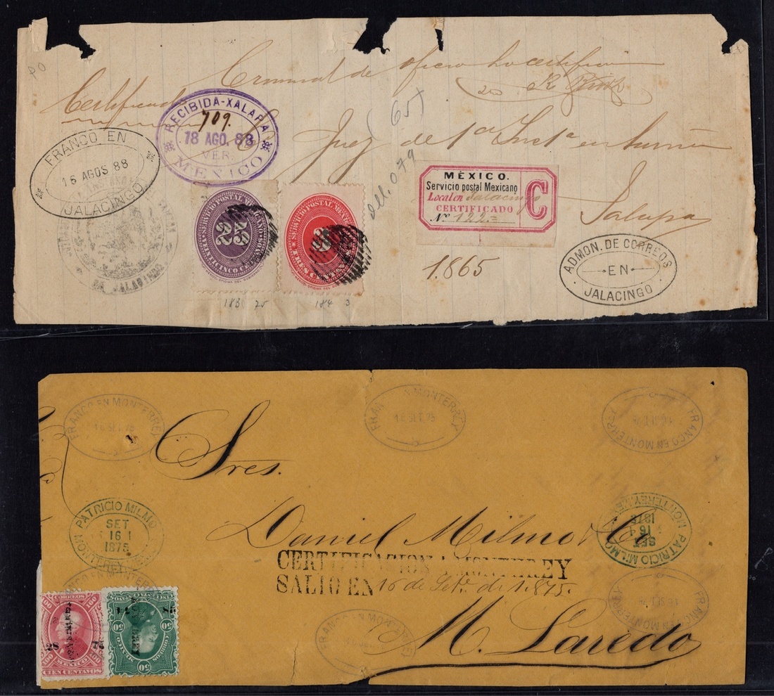 Monterrey, Jalapa Duo of registered fronts, one bearing 1874 "Hidalgos" 50c. Green and 100c. Carmine (#28-1874) dated September 16, 1875 from Monterrey to N. Laredo; the other with 1886 Large Numerals 25c. Lilac and 3c. Scarlet on judicial front dated August 18, 1888 from Jalacingo to Jalapa. Very rare registered mail as very few have survived (after two years, having been kept as proof of receipt, they must be destroyed by the post). Scott 110, 111, 183, 184