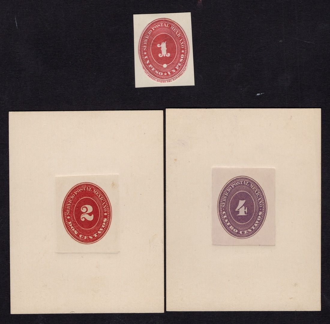 1886 2c. Carmine and 4c. Lilac, imperforate die proofs on card in issued colors, as well as the very rare 1 peso Red never issued on India paper, cut to shape and mounted on card. All with magnificent impressions, being rare and in beautiful condition. Scott 175v, 177v, NE.