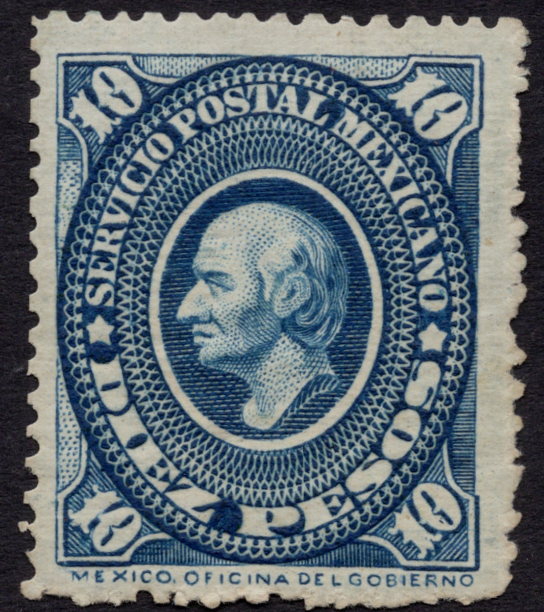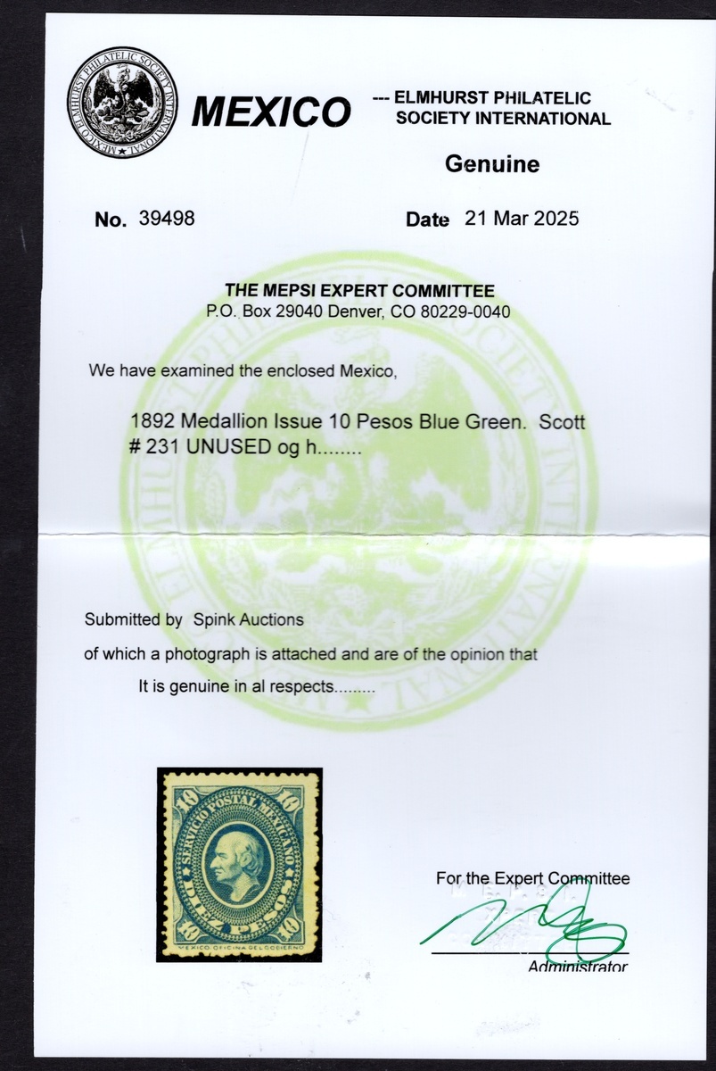 1892 10 Pesos Blue Green "Medallion", unused, centered slightly to left, watermarked and o.g. Very scarce; NF estimated that only 100 stamps were issued. Just five-seven unused examples may exist. 2025 MEPSI certificate. Scott 231, $7,000.
