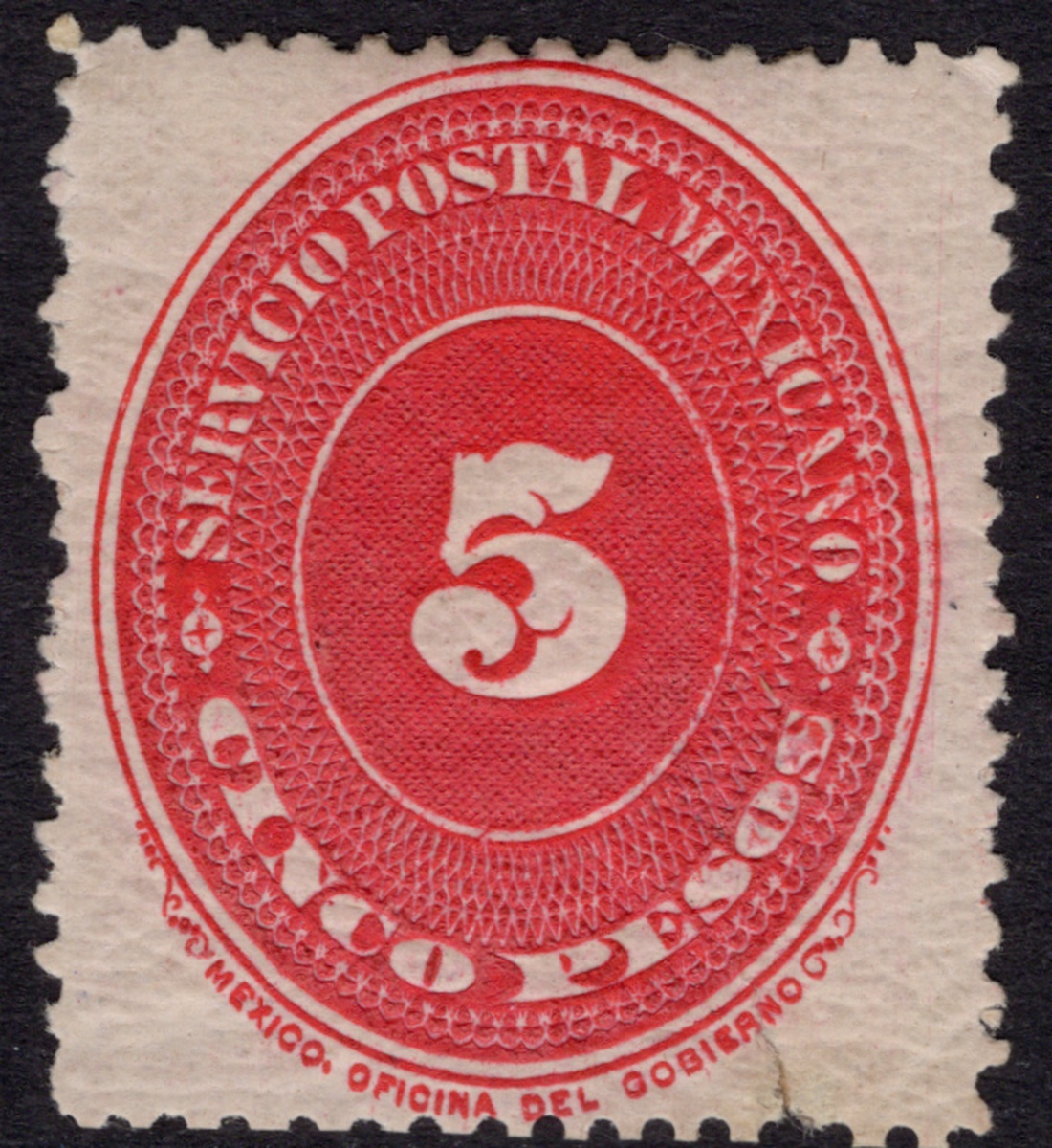 1892 5 Pesos Carmine, original gum and well centered. Tiny cut at bottom right not touching the design and one perforation missing; NF estimates that only 300 were issued. Scott 228, $1,250.