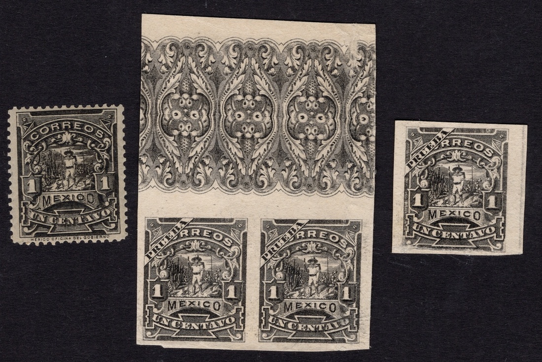 1895 1c. "Mulitas", imperforate sample specimen stamps on black on card, including one single and one pair. Both items displaying the "PRUEBA" banner diagonally at top right, with the pair having the elaborate fancy decorations in the sheet margin. Scott 242v. Note: These were samples produced by the British printer Bradbury and Wilkinson, with the purpose of showing the quality of their work to the Mexican postal authorities. They copied the existing design and printed very few. Only a couple of complete sheets are known. This firm was hired to produce the following stamp set in 1899. A stamp from the issue is included for comparison.