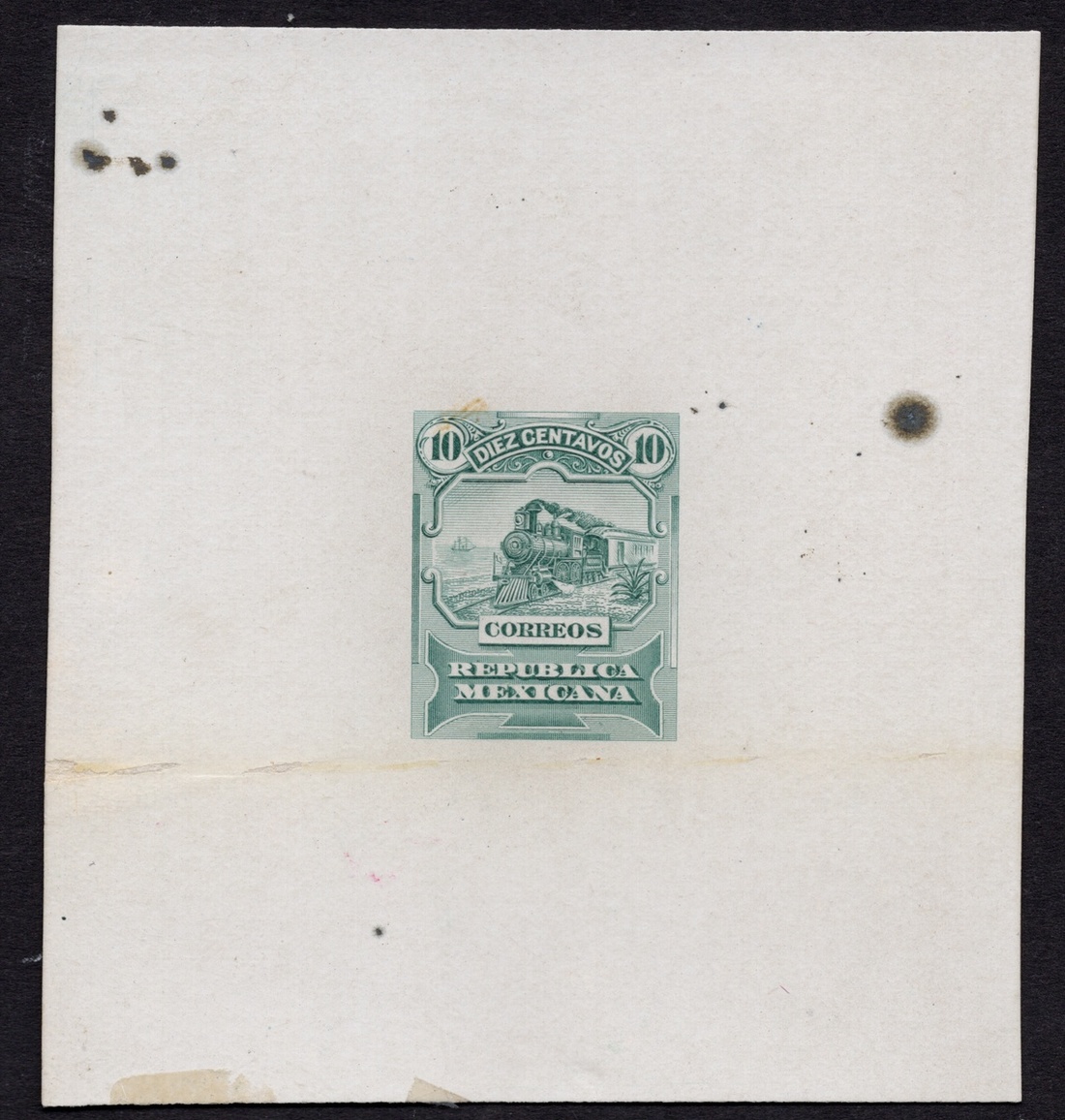 1895 10c. Green, die proof of unissued design (essay) on glossy card. Some oxidation spots not detracting from this unique piece. The only known example, exhibiting a similar design to the 10 Pesos, but denominated 10 centavos. Roberto Liera considered this one of the rarest items of Mexican philately. Ingham described it as "very scarce if not unique". Note: John Bash mentions this essay, and the other essay of the frame also offered in this sale, on page 312 of "Mexicana" (October 1964) and Chapman adds: "This proof is a designed by Edward Bouligay of 'Bouligay and Schmidt'. The die proof was damaged because it was applied pressure before being hardened and therefore is likely this is the unique example in existence".