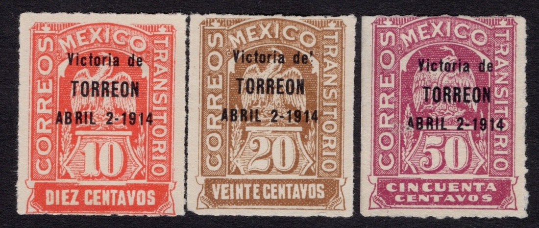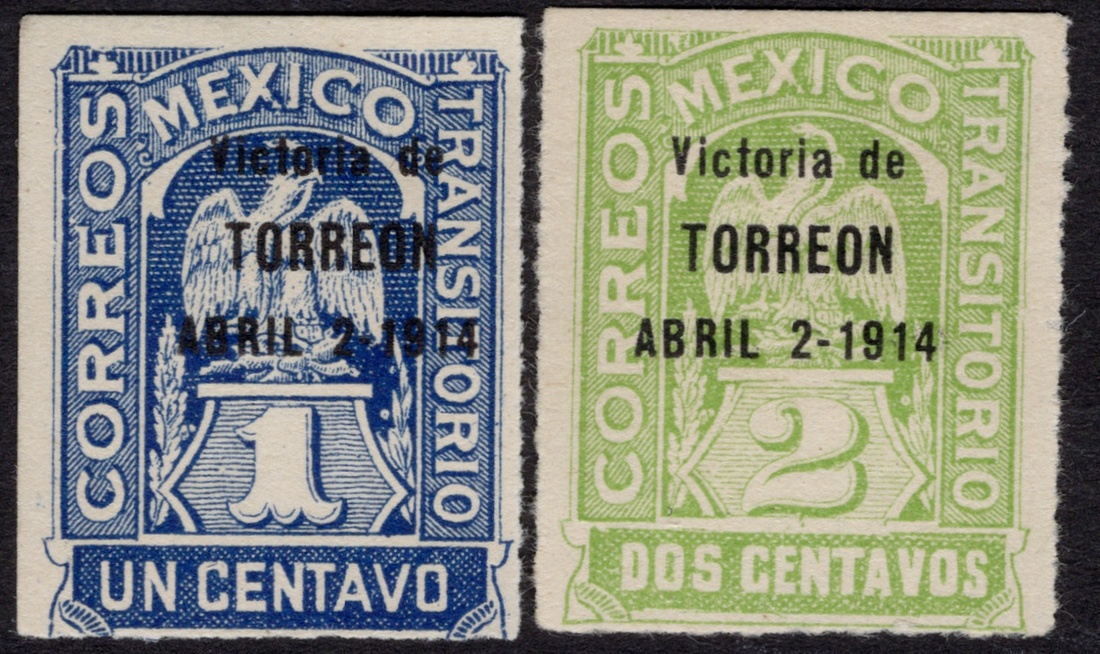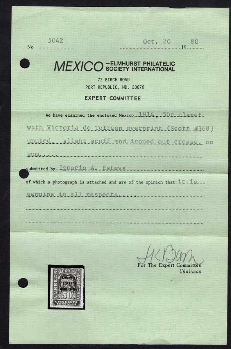 1914 "Victoria de Torreón" 1c.-50c., complete set unused, including 1c. and 10c. n.h., 50c. without gum, the rest being hinged. The 20c. with offset image of the overprint on the reverse (tiny nick in lower corner), the 2c. and 4c. with thin spots, and the 50c. affected by a slight scuff and iron-out crease. Only 100 20c. and 50 50c. were issued. 1970, 1980 MEPSI certificates for the 20c. and the 50c. Scott 362-368, $6,860.