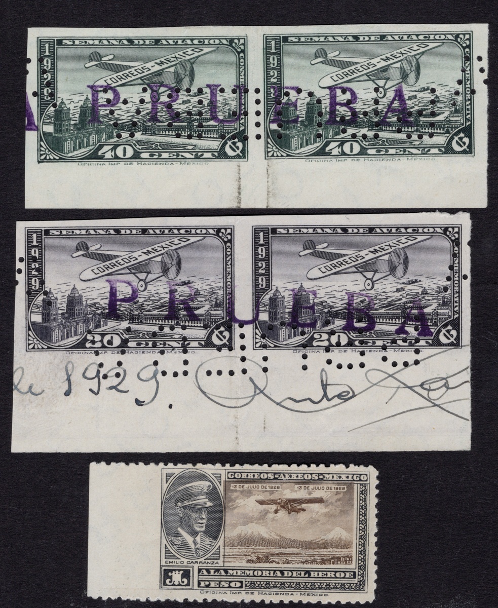 1929 Airmail 20c. Black Violet and 40c. Slate Green, horizontal imperforate pairs, the former with large selvage, dated and signed, at bottom; as well as Emilio Carranza 1 Peso imperforate at left. A scarce airmail trio. Scott C26v, C27v, C10v.