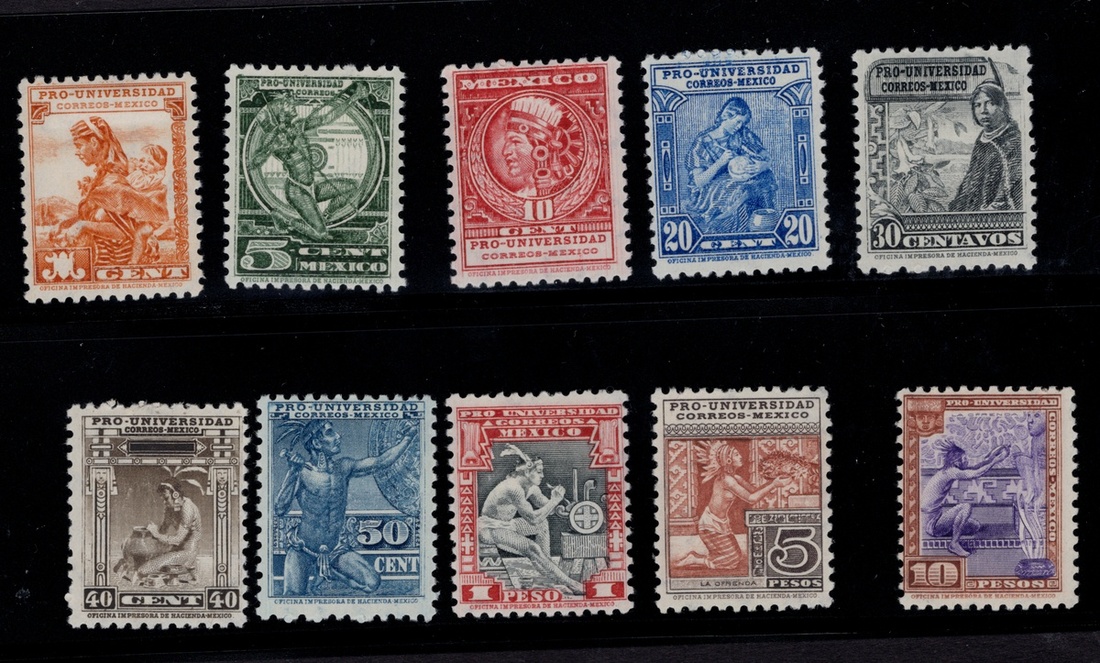 1934 "Pro Universidad", the complete set issued for the regular mail in unused condition, with original gum and hinged. The centering vary, including a well centered 5p. and the 10p. centered to top left but not affecting the design. Scott 698-706, RA 13B, $3,430.